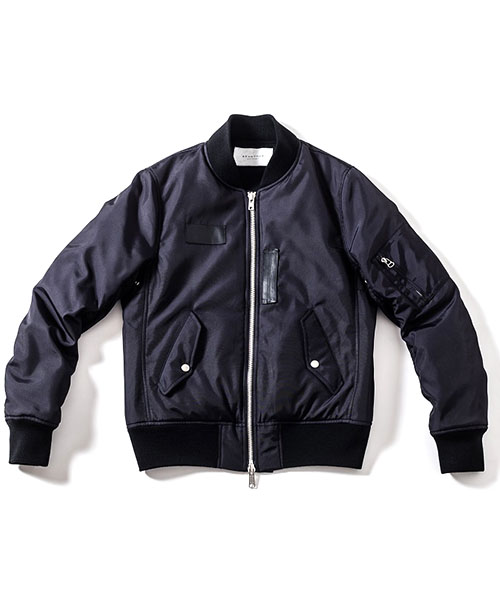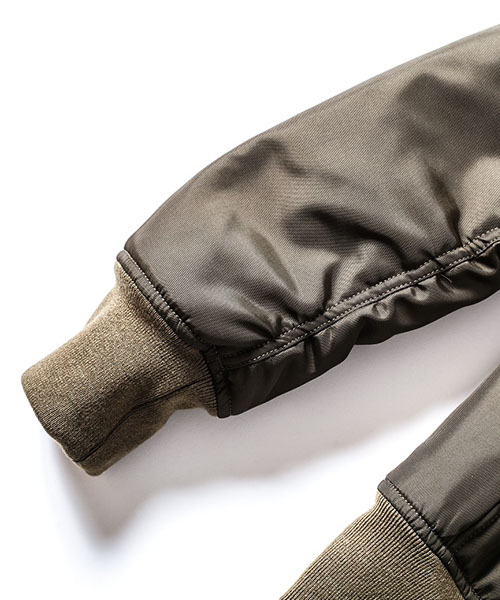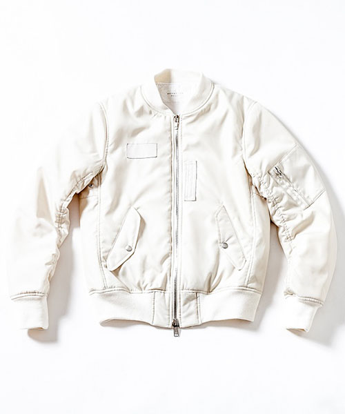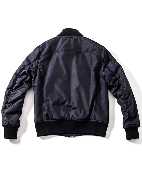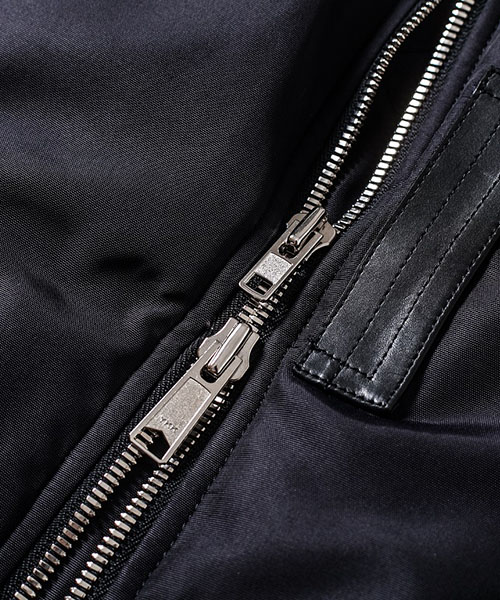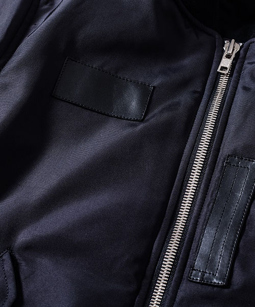 | spec | 1950年代初頭に、B-15型フライトジャケットの後継としてアメリカ空軍によって開発されたMA-1型フライトジャケットをベースに作製。身頃裏、袋布には起毛コットン、袖には肌滑りの良いキュプラ素材を使用。ファスナーには高品質なYKK EXCELLAファスナーを採用。全体厚めの中綿を挟み込む事によって保温性を高めている。フロントには革パッチを配置し、パッカリング縫製を施した袖仕様を採用しMA-1のディティールを再現。 |