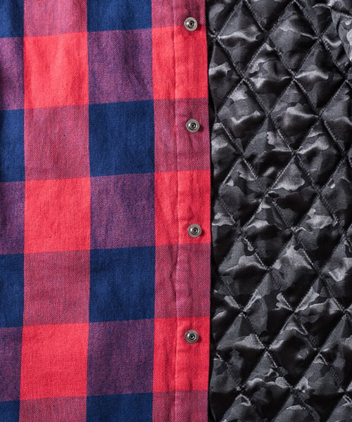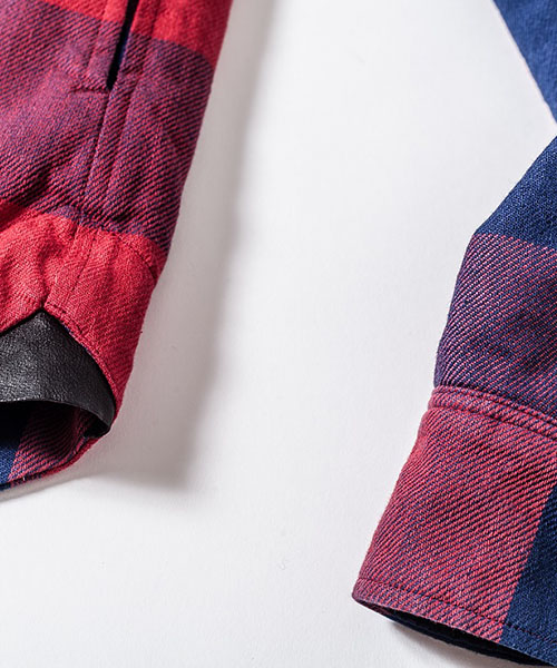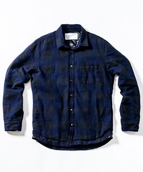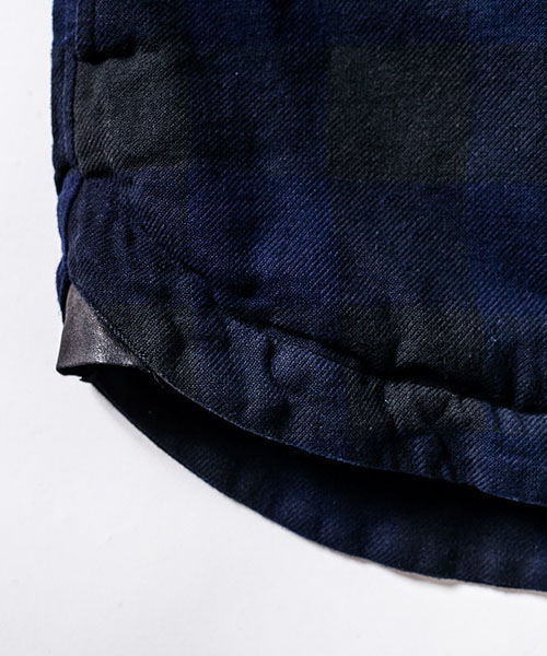 | spec | 裏地に中綿キルト加工を施した迷彩ジャガード生地を使用したシャツアウター。左胸にポケット、両脇にもポケットを追加してアウターとしても機能するディティールを配置。ドット釦にオリジナルで作製したでレザーくるみドット釦を使用。両脇裾にはレザーを使用したマチを配置。縫製後ワンウォッシュ加工を施す事で、インディゴ染料を使用した生地の風合いを生かした1着。 |