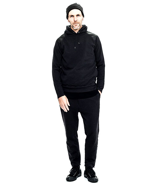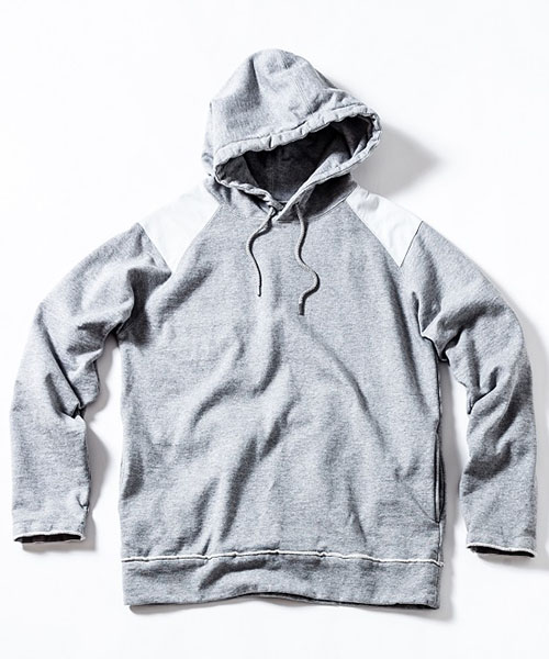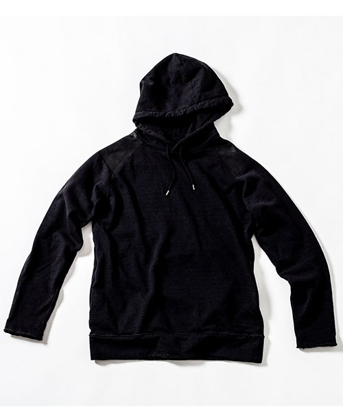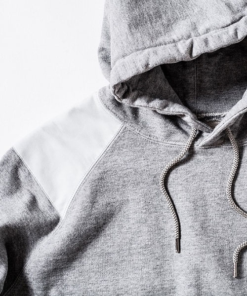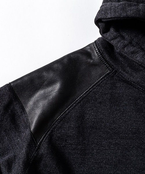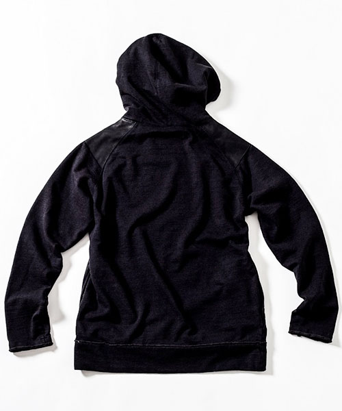 | spec | ラグラン仕様で肩にはレザーパーツを配置。両脇にはポケットを配置。フードは大きめに設定し、ドローコード仕様。Vintage調の生地を生かしたカットオフディティールを採用。袖口裏には杉綾テープを叩き付け、伸び止め機能も追加。縫製後ワンウォッシュ加工を施している。 |