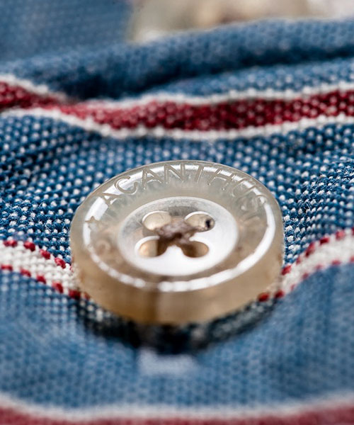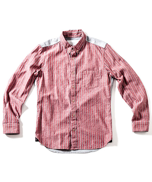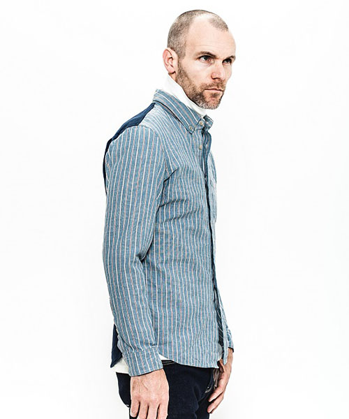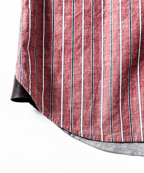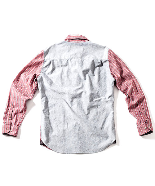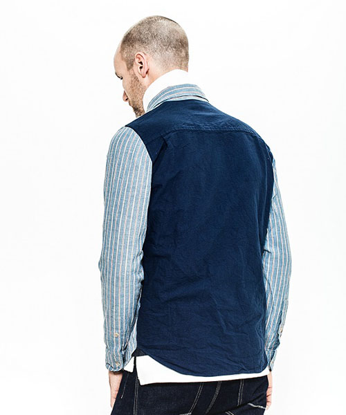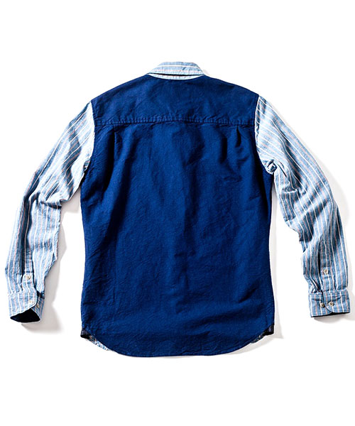 | spec | 前身頃~袖をストライプ、後身頃をオックスの無地で切り替えたクレイジーパターンのシャツ。両方共にインディゴ染めを施している生地を使用している。釦にはACANTHUS刻印入りのオリジナル釦を使用。両脇裾にはレザーを使用したマチを配置。ワンウォッシュ加工を施す事で生地の風合いを向上。着込む事で味わい深く変化する一枚。 |