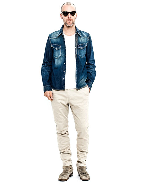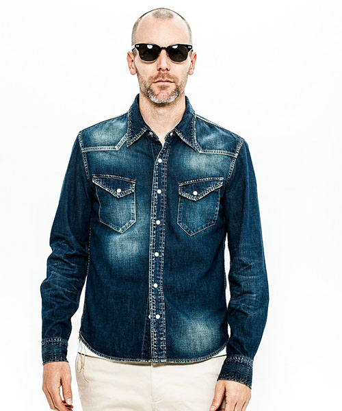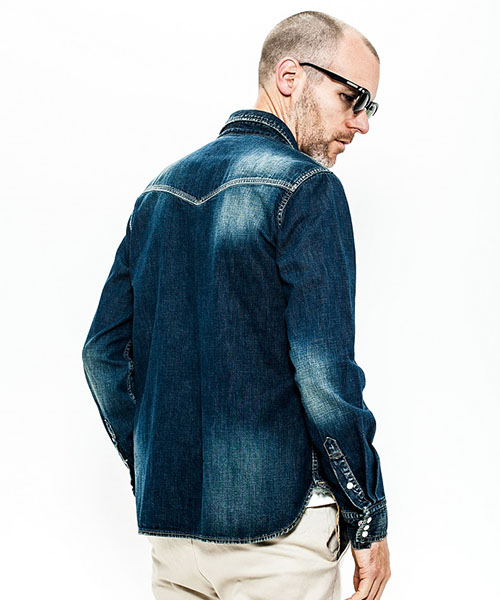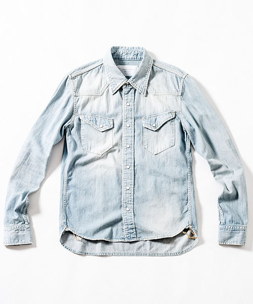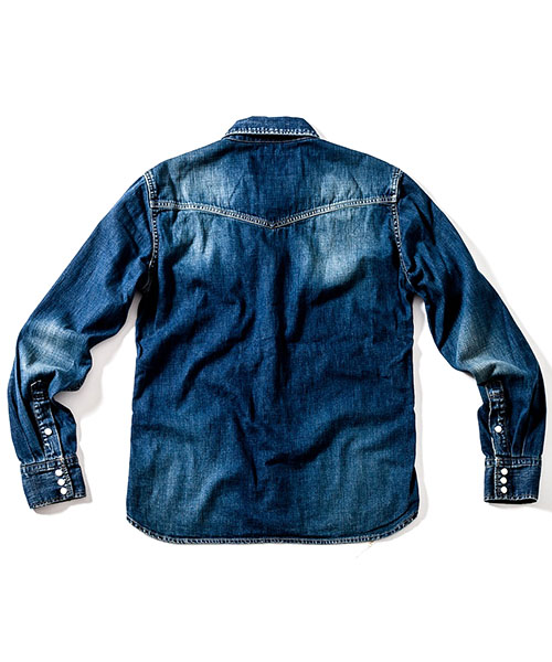 | spec | 8ozのデニムを使用したウエスタンシャツ。チェーンステッチの仕様に加え、細部によって異なる番手、色の糸で縫製をする事で、加工による表情を変化させている。裾脇にはチェーンステッチを流した仕様。釦にはパールタイプのベルナップ釦を使用している。世界でもトップクラスのデニム加工技術を有する岡山児島で生地の手配から縫製、ダメージ加工まで施した一枚。 |