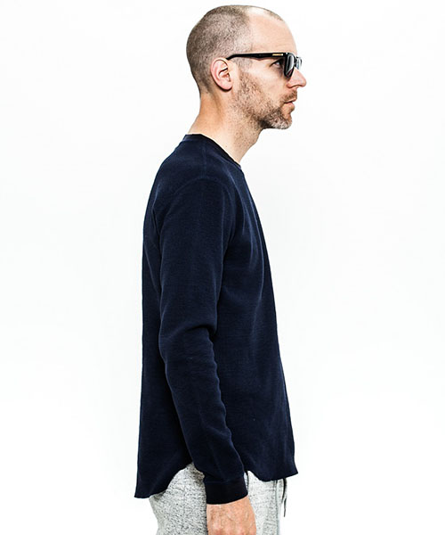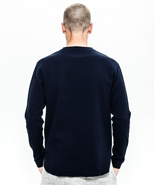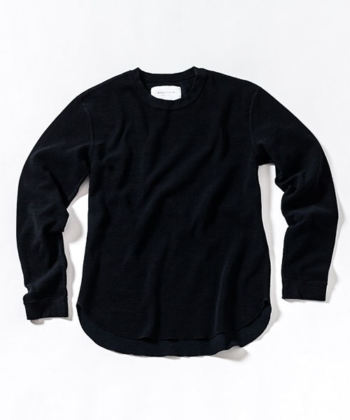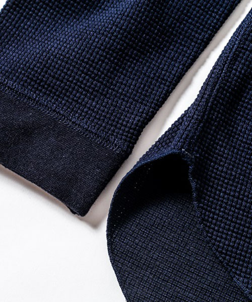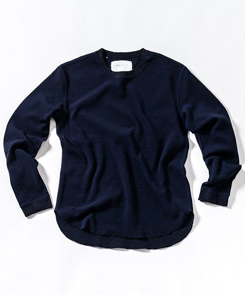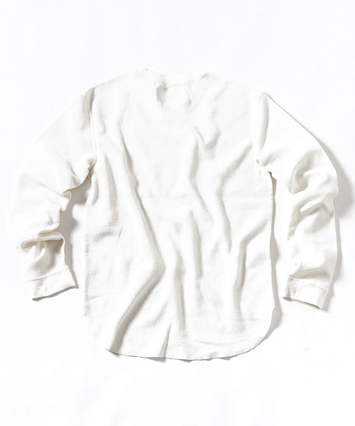 | spec | 保温性に優れたサーマル生地を使用したラグランスリーブ仕様のロングスリーブTシャツ。裾はラウンド仕様。3本針表振りにて縫製。袖口はリブ仕様をなっている。脇裾、袖リブには、ボディと近い色で配色した閂を施している。縫製後ワンウォッシュ加工にて仕上げた1枚。 |