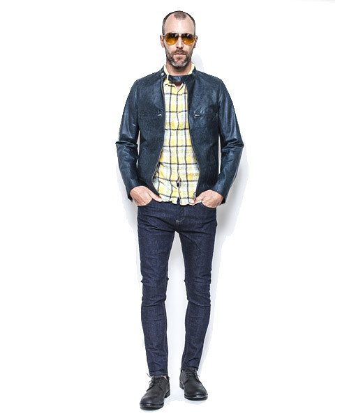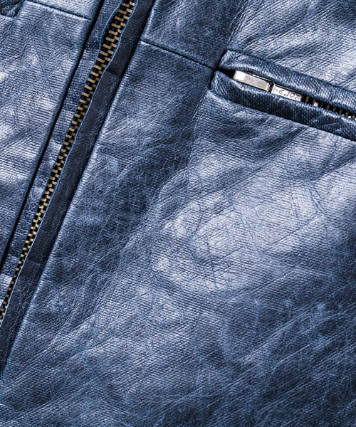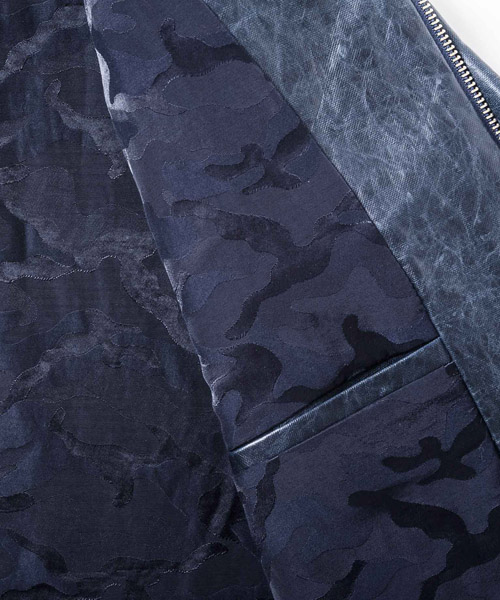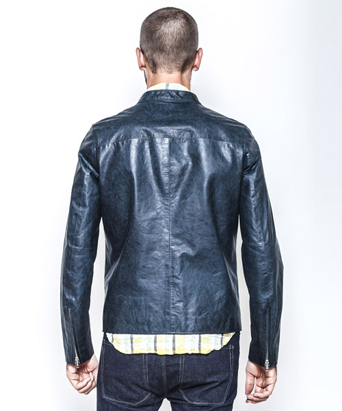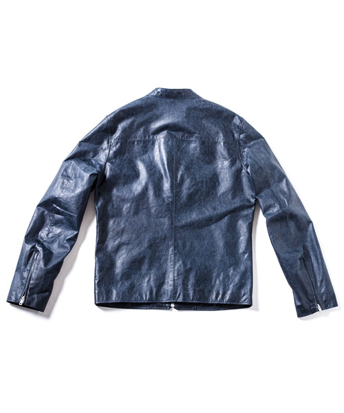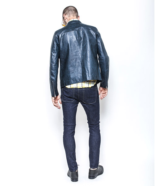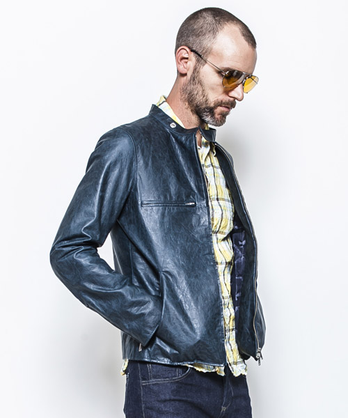 | spec | クラシックなデザインのライダースジャケット。前端はレザーの裁ち切りパターンを使用したムシ隠し仕様。身頃裏には迷彩パターンの6/4クロス、袖裏には袖通りの良い上質なキュプラ生地を使用。ファスナーにはTALONファスナーを使用。 |