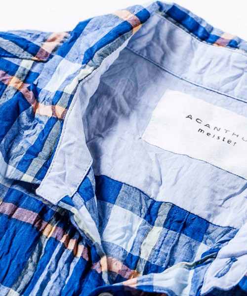 | spec | 衿裏、ヨーク裏、カフス裏も肌の当たる部分には同色系の薄手のローン生地にて切り替えている。釦には10mm幅の小ぶりのACANTHUS刻印入りのオリジナル釦を使用。第3、第4釦には表裏にボタンが付き、おがみ合わせで釦を閉める事も可能。おがみ合わせにすることで、よりラフな着こなしを楽しむ事ができる。縫製後特殊なシワ加工を施して仕上げている。春夏らしい軽やかなで上質な素材で仕上げた一枚。 |