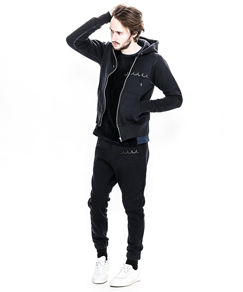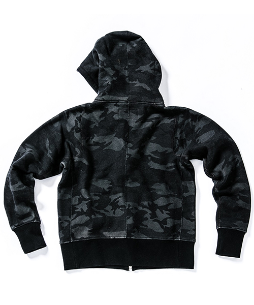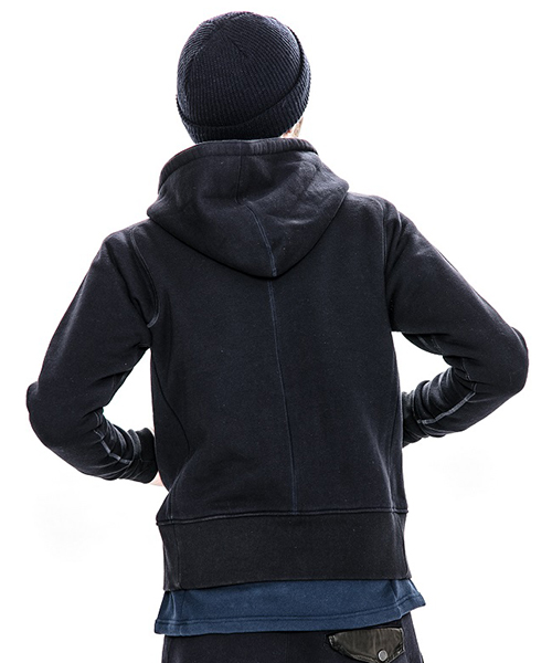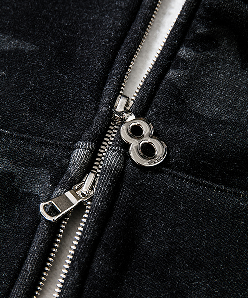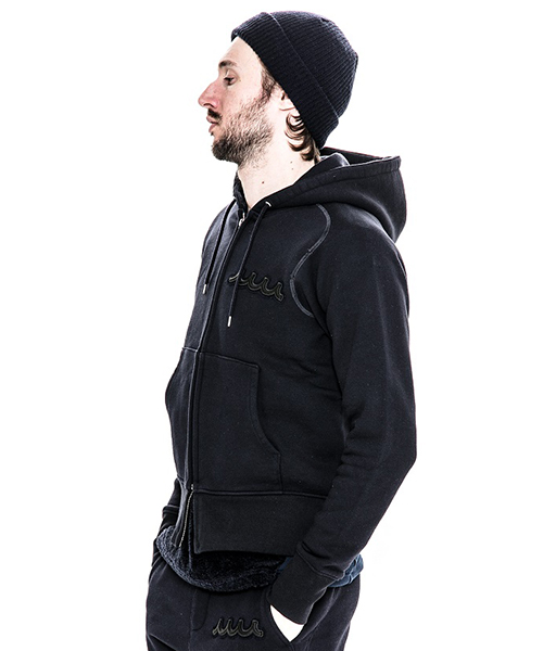 | spec | mutaとのコラボレーションコレクションのフルジップフーディー。胸には贅沢にレザーで作製したmutaロゴワッペンを配置。ファスナーには高品質なYKK EXCELLAファスナーを採用し、上部ファスナー引き手にはmutaの8ロゴファスナーを使用。特徴はアームスリーブ脇のマチ付き仕様の袖付け。軍隊の運動時に、腕を上げた際に裾が上がり、肌が見えないように開発されたと言われている通称フリーダムスリーブ。脇にマチを配置する事で肩、腕が動き易い仕様となっている。40年代~50年代のスウェットアイテムに見られるディティールだが、縫製コストのかかる仕様で徐々に姿を消していったと言われている。現在も技術の高い縫製者が必要な仕様。袖と裾には肌触りの良いフライス生地を使用。上質な裏毛生地と、ヴィンテージデティールを現代的なシルエットで仕上げた1着。 |