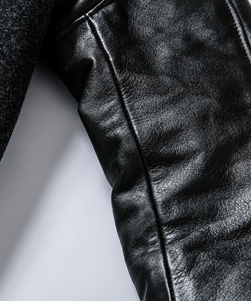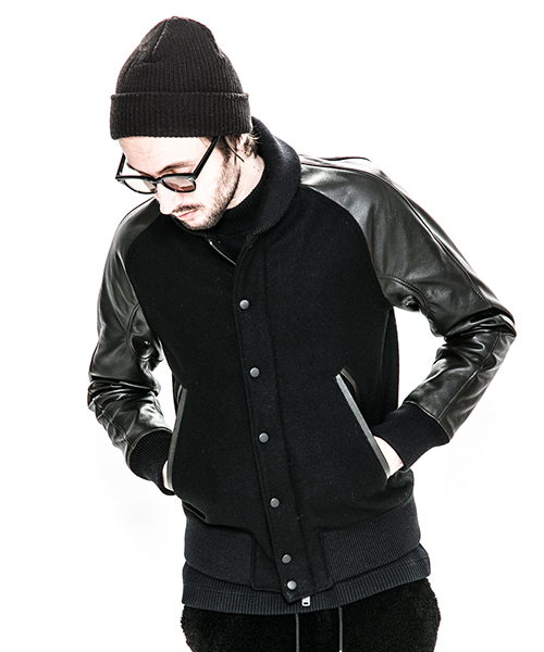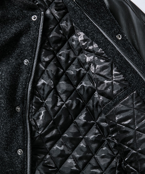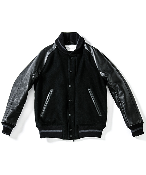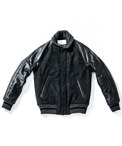 | spec | ラグランスリーブのスタジアムジャケット。袖のレザーには着用時に生まれる袖のシワを表現した3D加工を施している。リブには配色ラインを編み込んだ特注リブを使用。ファスナーにはTALON社製、ドット釦は同色系のレザー包んだオリジナルくるみドット釦を使用。身頃裏にはキルト加工を施した迷彩ジャガード生地、袖裏には中綿を挟んだ袖通りの良い上質なキュプラ生地、袋布には起毛コットンを使用し保温性を高めている。素材、縫製、加工あらゆる面に技術と拘りを詰め込んだ1着。 |
