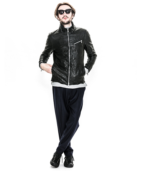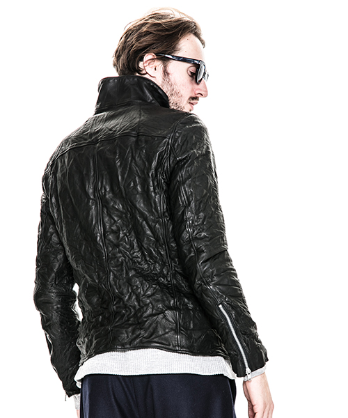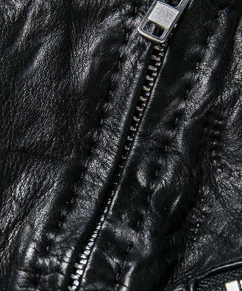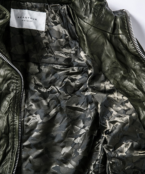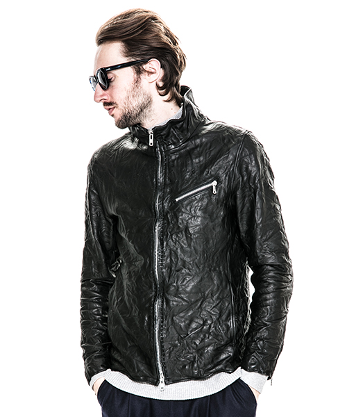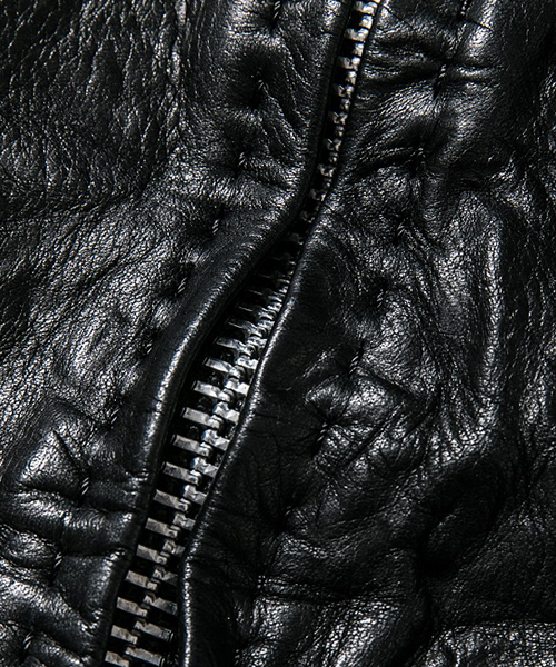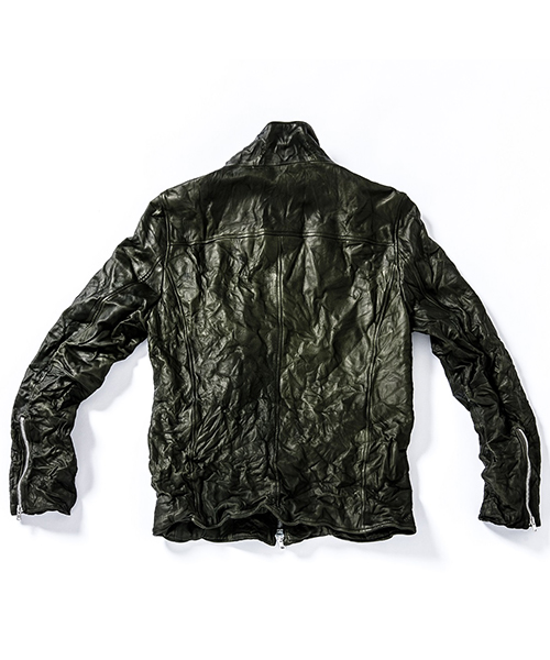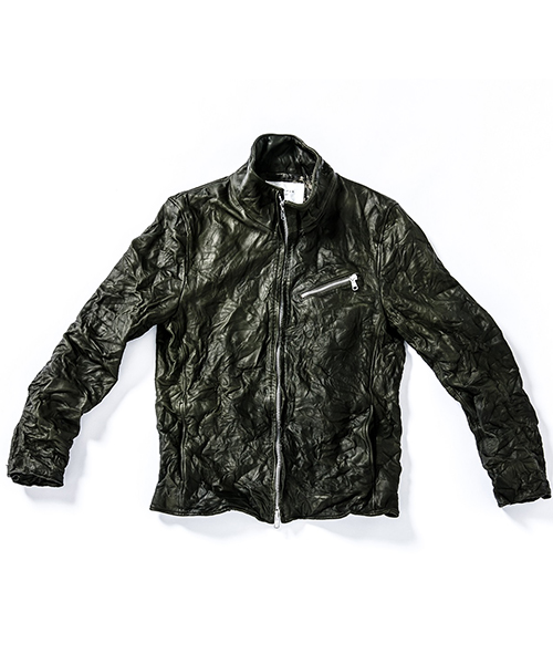 | spec | スポーツテイストなトラックJKT、ライダースJKTの要素をミックスしたデザイン。重厚なキップレザーの製品ドラミング加工にて仕上げている。身頃裏にはポリエステルの迷彩ジャガード素材、袖には肌滑りの良いキュプラ素材、袋布にはコットン生地を使用。ファスナーには無地のYKKファスナーを採用。フロントには職人手作業による、0番手の糸を用いたハンドステッチを大胆に配置。最終工程では、1点づつ丁寧にシワ加工を施して仕上げている。 |