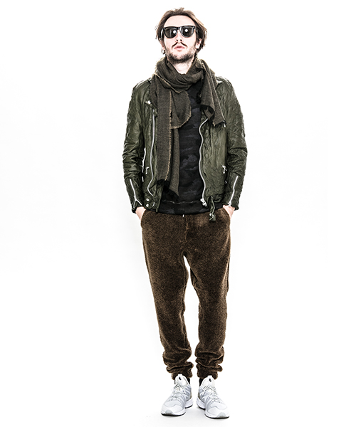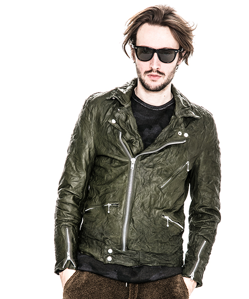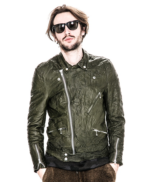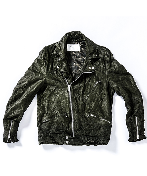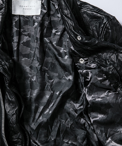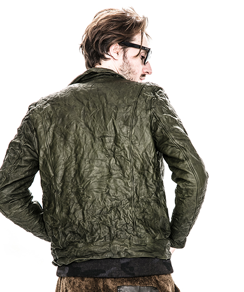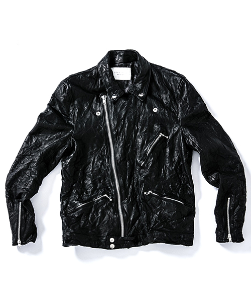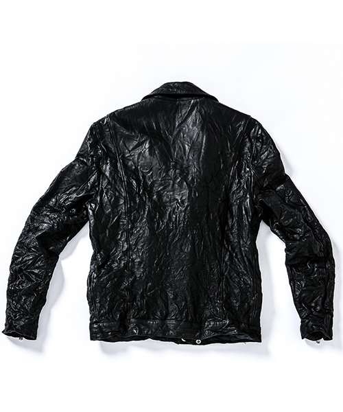 | spec | イギリスモーターサイクルのライダースジャケットに見られるディテールを採用。重厚なキップレザーの製品ドラミング加工にて仕上げている。身頃裏にはポリエステルの迷彩ジャガード素材、袖には肌滑りの良いキュプラ素材、袋布にはコットン生地を使用。ファスナーには無地のYKKファスナーを採用。最終工程では、1点づつ丁寧にシワ加工を施して仕上げている。 |