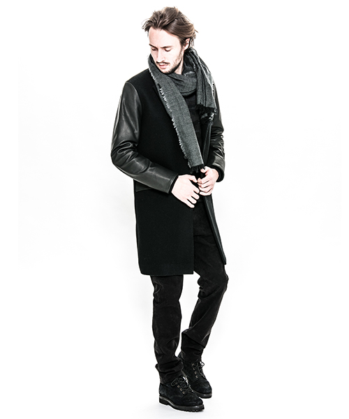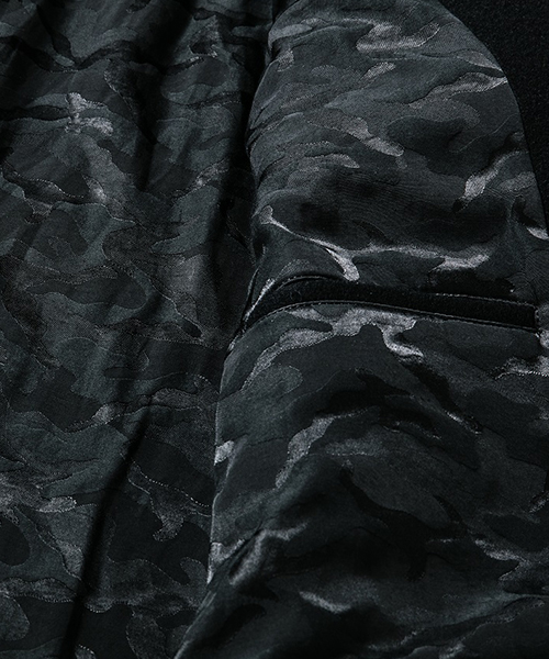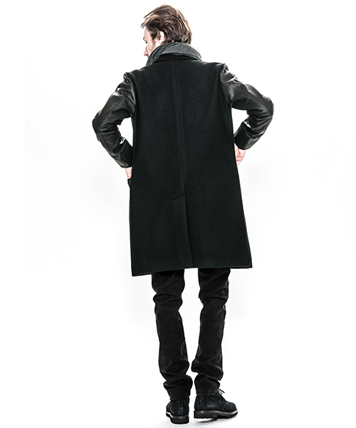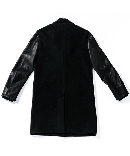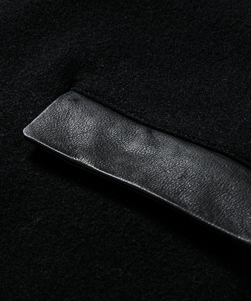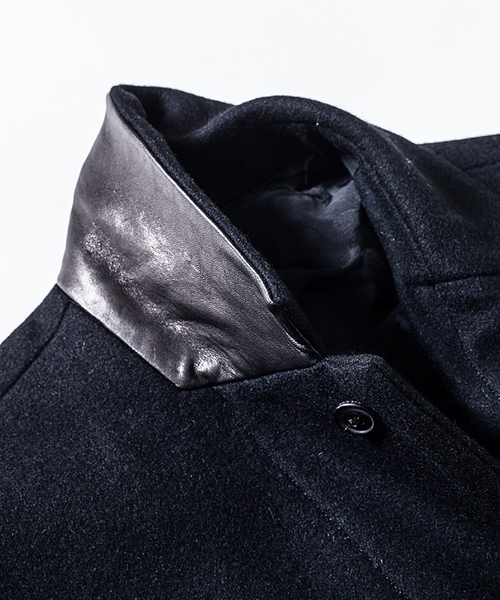 | spec | シルエットの美しいチェスターコートを保温性の高い上質なメルトン生地×カウレザーで仕上げた1着。肉厚なコットン、ナイロンの迷彩ジャガード6/4クロス、袖には肌滑りの良いキュプラ素材、袋布には起毛コットン生地を使用。袖口には内リブを配置。釦にはオリジナルで作製したレザーくるみ釦を使用。取替え用として本水牛釦も付属する。ラフな着心地を重視した肩パッド無しの仕様で、綺麗なシルエットに仕上げた1着。 |