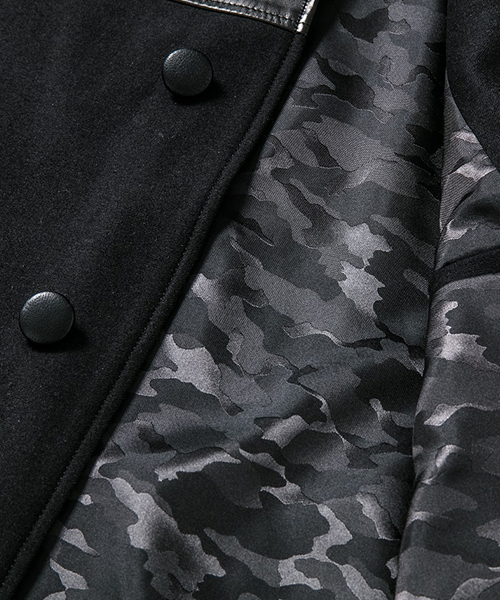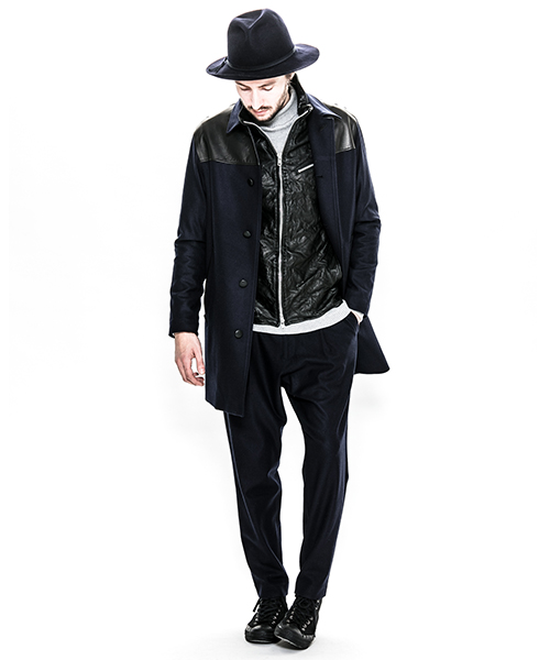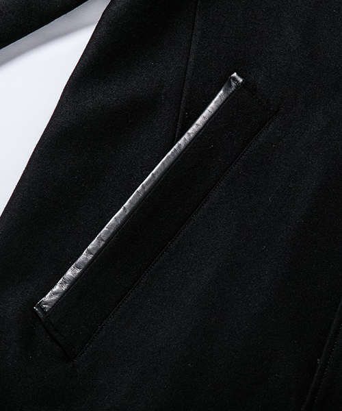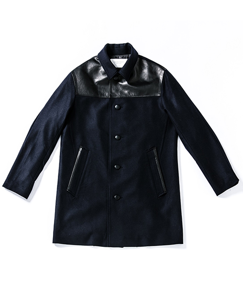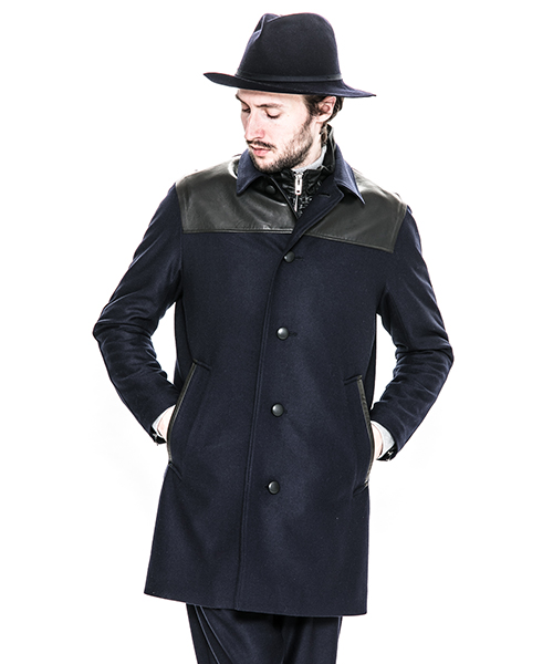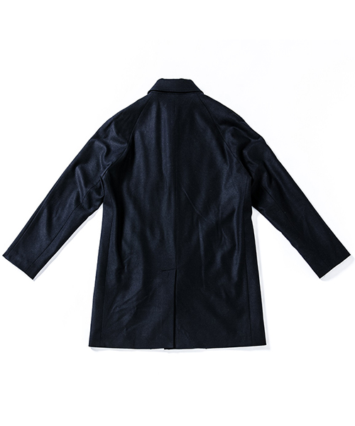 | spec | ヨーク、脇ポケットにクロムなめしにて仕上げたラムレザーを使用したオーバーコート。身頃裏にはポリエステルの迷彩ジャガード素材、袖には肌滑りの良いキュプラ素材、袋布には起毛コットン生地を使用。釦にはオリジナルで作製したレザーくるみ釦を使用。取替え用として本水牛釦も付属する。ラフな着心地を重視した肩パッド無しの仕様で、全体的にゆとりを持たせた、外套(オーバーコート)としても使用できるサイズ感に仕上げている。前から見るとセットイン、後ろから見るとラグランスリーブという凝ったパターンディティールも特徴。落ち感のある素材とシルエットで時代にフィットしたリラックス感のある1着。 |
