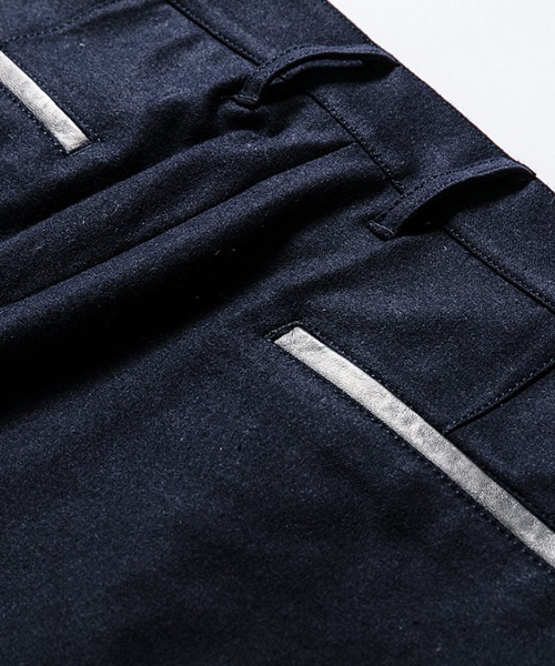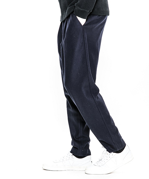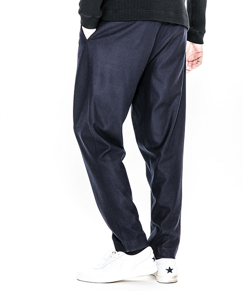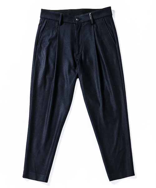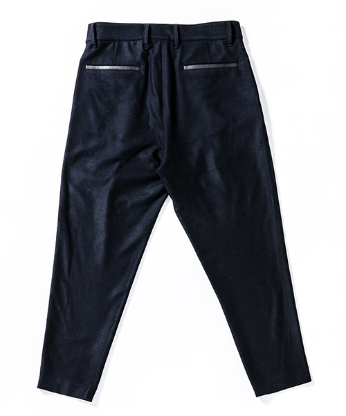 | spec | 左前ベルトループ 、後ろポケットにクロムなめしにて仕上げたラムレザーを使用した9分丈のワンタックパンツ。袋布にはコットン生地を使用。釦にはオリジナルで作製したレザーくるみ釦を使用。取替え用として本水牛釦も付属する。ワンタックをとったリラックスした腰周りから、裾に向かってテーパードさせた綺麗なシルエット。落ち感のある素材とシルエットで時代にフィットしたリラックス感のある1本。 |