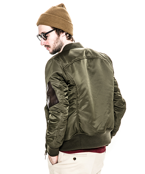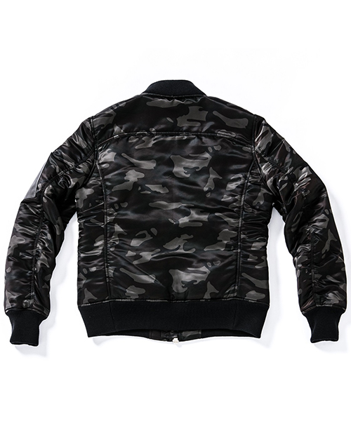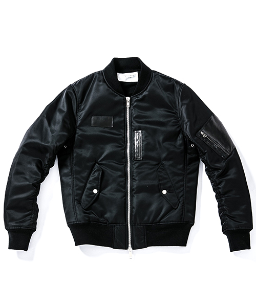 | spec | 1950年代初頭に、B-15型フライトジャケットの後継としてアメリカ空軍によって開発されたMA-1型フライトジャケットをベースに作製。身頃裏、袋布には起毛コットン、袖には肌滑りの良いキュプラ素材を使用。ファスナーには高品質なYKK EXCELLAファスナーを採用。全体厚めの中綿を挟み込む事によって保温性を高めている。フロント、左袖PKにはラムレザーを配置し、パッカリング縫製を施した袖仕様を採用しMA-1のディティールを再現。 |