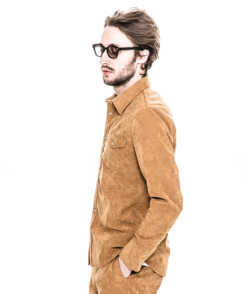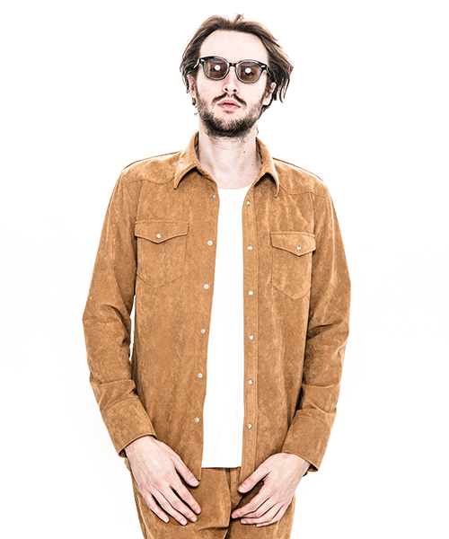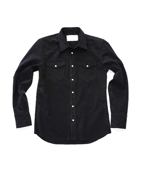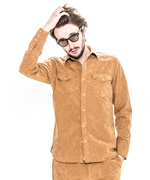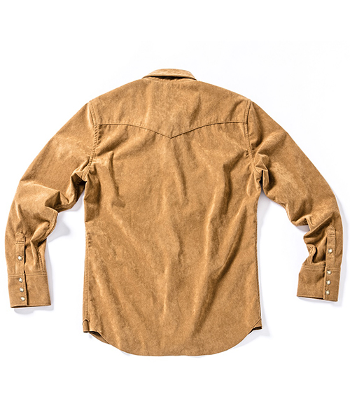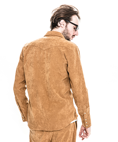 | spec | アーカイブからウエスタンシャツを人工皮革スウェードにて製作。裾は不織布の為ほつれの心配の無い切りっぱなし仕様。釦にはパールタイプのベルナップ釦を使用している。縫製後ワンウォッシュ加工を施しアタリ感、生地の加工感を追加。高品質で現代的な人工皮革素材で、仕上げたベーシックな1枚。 |