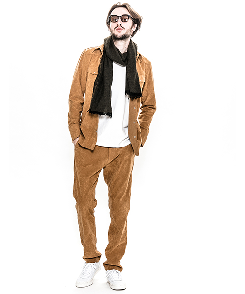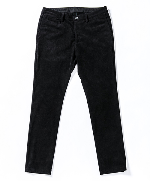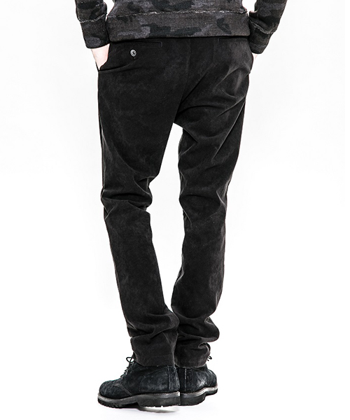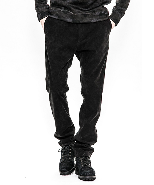 | spec | 人工皮革スウェードを使用したタイトチノパンツ。ファスナーにはYKK universalファスナーを使用。縫製後ワンウォッシュ加工を施しアタリ感、生地の加工感を追加。裾に向かってテーパードさせたタイトシルエット。シーズン毎に若干のパターン修正を加え、アップデートを繰り返しリリースしている定番的な1本を高品質で現代的な人工皮革素材で仕上げた。 |