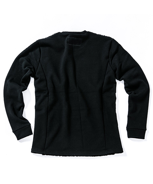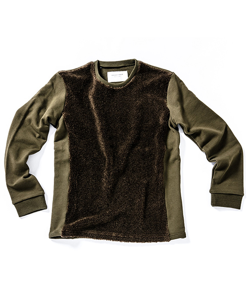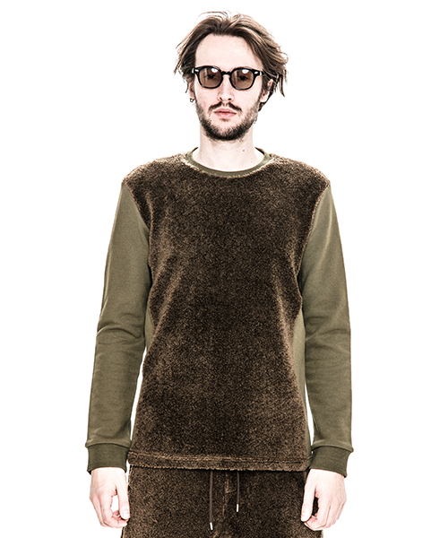 前身頃に特徴的なふわふわのトイプー起毛ジャージ、その他は裏毛ジャージで仕上げたスウェットシャツ。適度な肉感で軽やかな着心地となっている。袖、首元はフライスリブ仕様。生地の風合いで1枚でも存在感のある1枚。