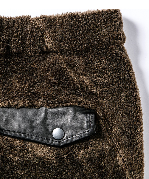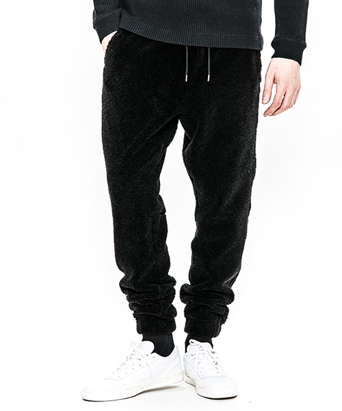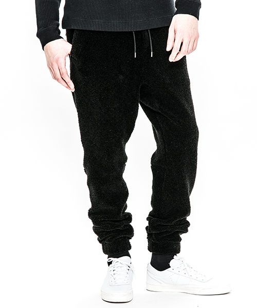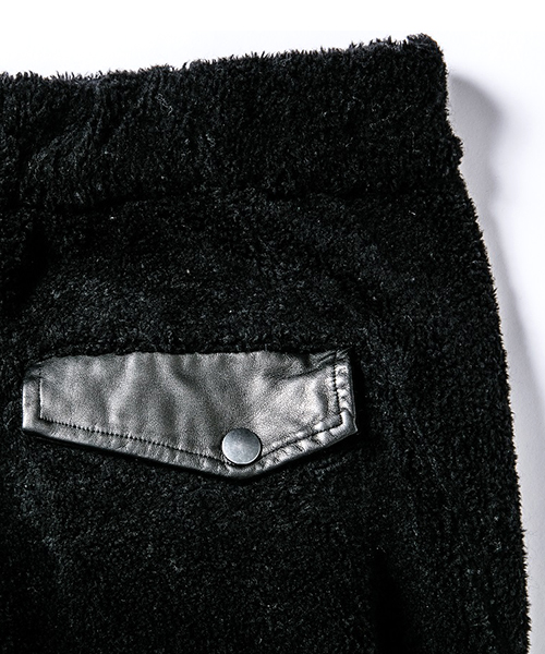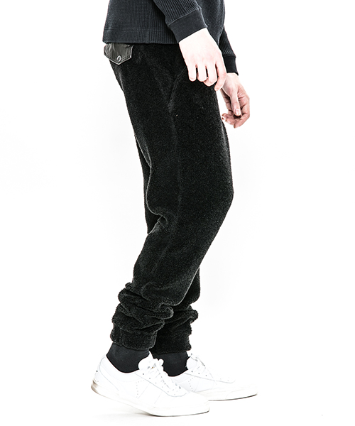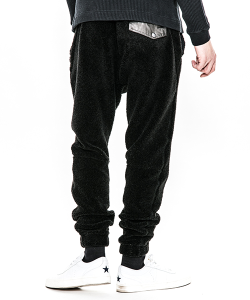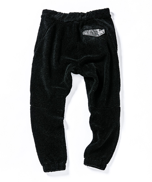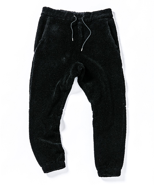 | spec | ふわふわのトイプー起毛ジャージを使用したスウェットパンツ。ウエスト、裾は平ゴム仕様。股にはマチを配置し動き易さを考慮したディティール。バックにはラムレザーを使用したフラップ付きポケットを配置。ワンウォッシュ加工仕上げ。腰回りはゆとりを持たせ、裾に向かって綺麗にテーパードさせたシルエット。希少な生地でリラックス感たっぷりに仕上げた1本。 |