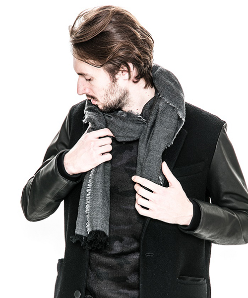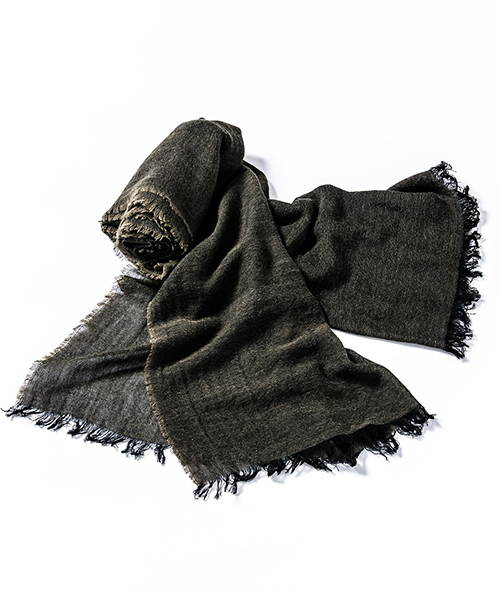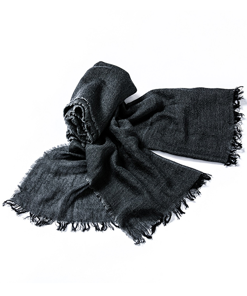 タテ糸にウール100%糸、ヨコ糸に大正紡績高級素材、カシミヤ60%/綿25%/シルク15%の混紡糸を使用し編み立てたニットストール。 綿の原料は超長綿を使用。良質な原料を使用している為、非常に軽く保温性に富んでいる。80cm×190cmの大判で様々な巻き方が可能。