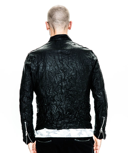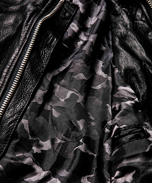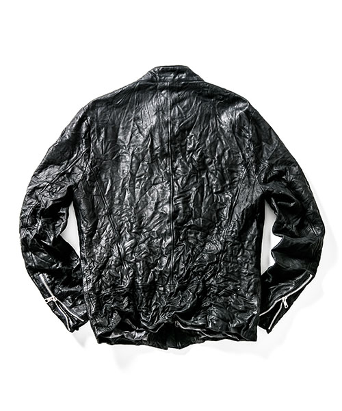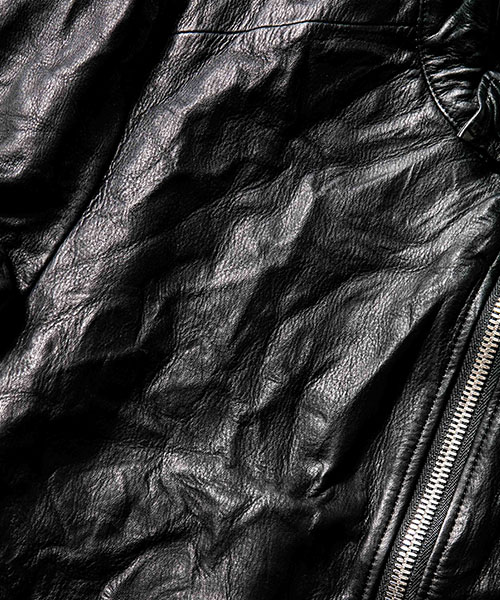 | spec | マチ付きの袖口、衿タブ、重厚感のあるファスナー等ヴィンテージに見られるディティールをベースに、クラシックなアメリカンモーターサイクルのライダースジャケットを製作。身頃裏にはポリエステルの迷彩ジャガード6/4クロス、袖には肌滑りの良いキュプラ素材を使用。ファスナーには高品質なYKK EXCELLAファスナーを採用。革の表情を最大限に引き出す、職人の手作業によるシワ加工を全体に施している。 |