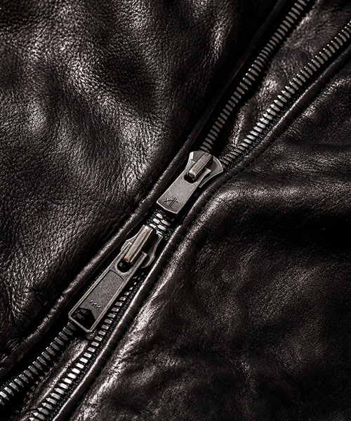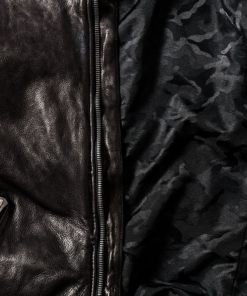 | spec | カーフという稀有な素材を大胆に製品染めした1着。マチ付きの袖口、衿タブ、重厚感のあるファスナー等ヴィンテージに見られるディティールをベースに、クラシックなアメリカンモーターサイクルのライダースジャケットをベースに製作。裏地にはポリエステルの迷彩ジャガード生地を採用。ファスナーにはハードな製品染め加工に耐えうる高品質なYKK EXCELLAファスナーを採用。オイルをたっぷりと浸透させて製品染めを施す事で滑らかな質感を実現している。製品染めでしか表現できない色味と素材感、革の価値を十分に体感する事のできる1着。 |