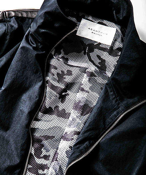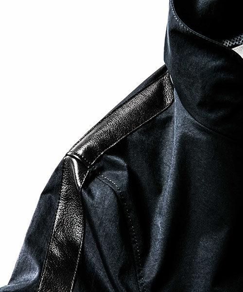 | spec | 高機能素材とレザーを用いて作製したトラックJKT。肩~袖口にかけてレザーラインを配置。レザーには水洗い可能なウォッシャブルレザーを使用。ファスナーには高品質なYKK EXCELLAファスナーを採用。裏地には通気性に優れたメッシュ素材を使用。裾はドローコードにて調節可能。 |