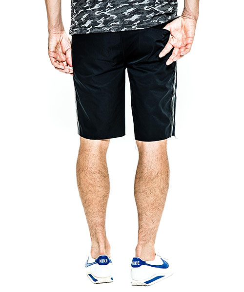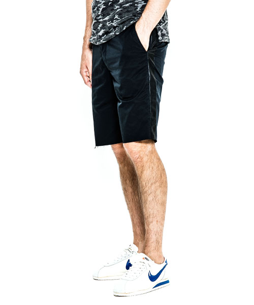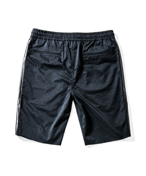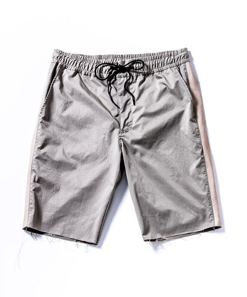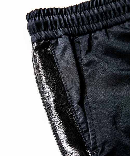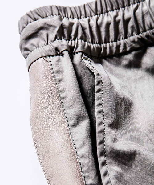 | spec | 高機能素材とレザーを用いて作製したトラックショーツ。脇にかけてレザーラインを配置。レザーには水洗い可能なウォッシャブルレザーを使用。ウエストのコードにもレザーコードを採用。裾は切りっぱなし仕様。ファスナーには高品質なYKK EXCELLAファスナーを採用し前明き仕様。 |