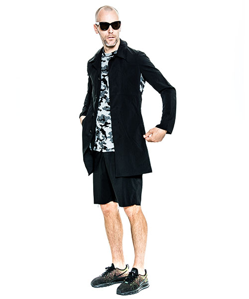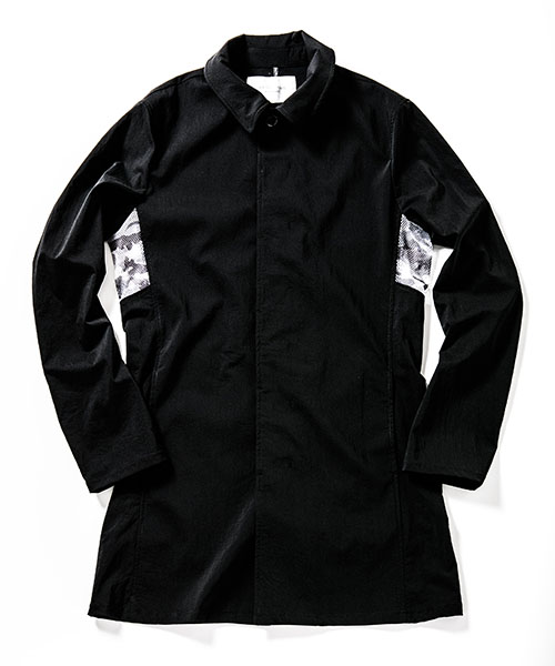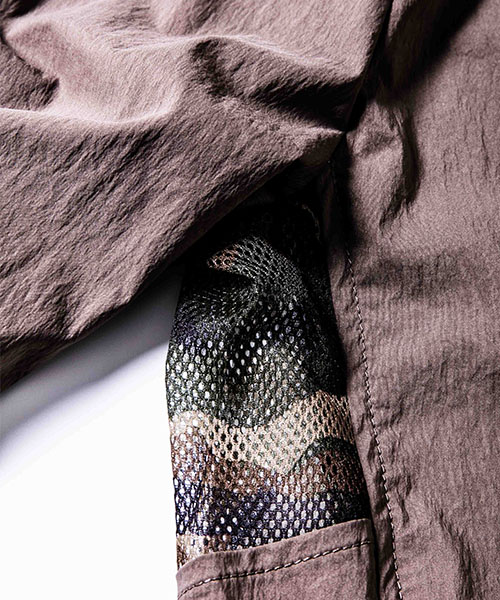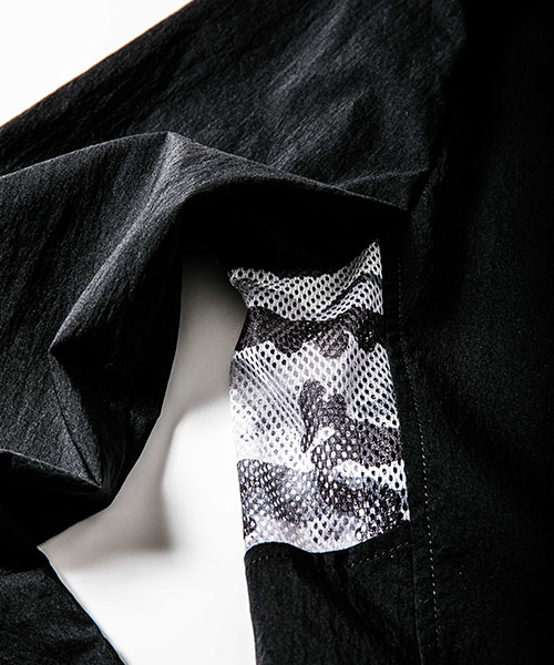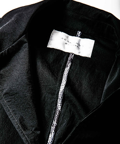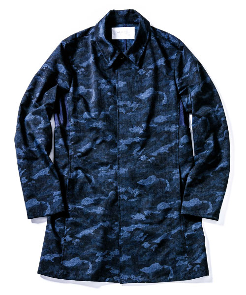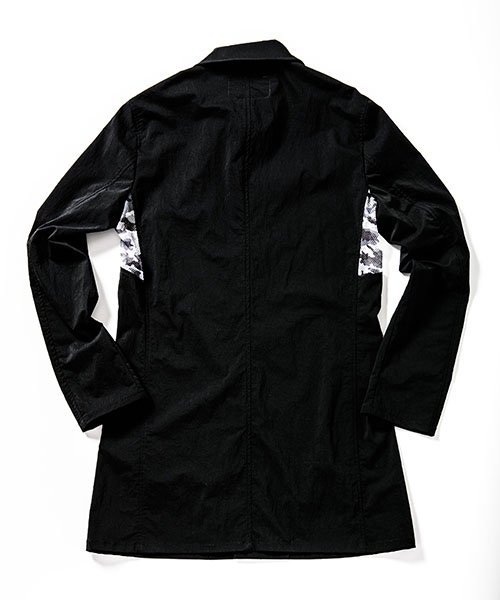 | spec | 軽やかな素材を用いたシャツコート。脇にはメッシュ素材にて切り替えを配置。背中心裏には同メッシュ素材にてパイピング始末。衿周りにはワイヤーを入れて調節が可能。前明きはトップ釦以外は比翼仕様。両脇にはポケットを配置。 |