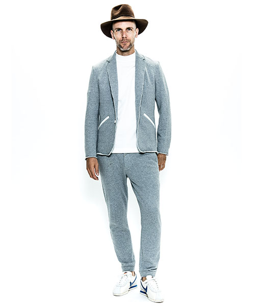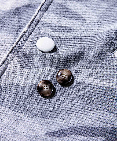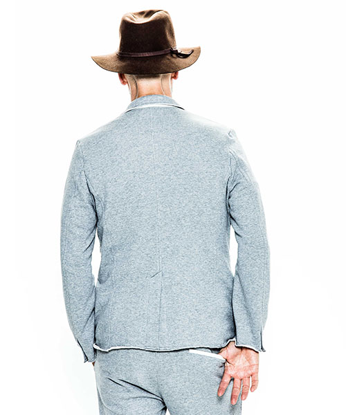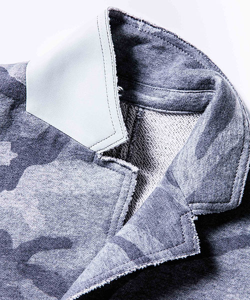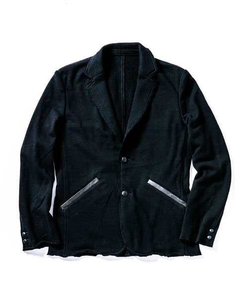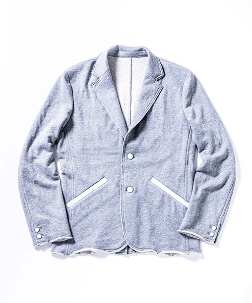 | spec | 2BテーラードJKT。釦にはオリジナルで作製したレザーくるみ釦を使用。取替え用として本水牛釦も付属する。裏毛生地を生かしたカットオフディティールを採用。上衿裏、脇ポケット口にはレザーを配置。縫製後ワンウォッシュ加工を施して仕上げている。 |