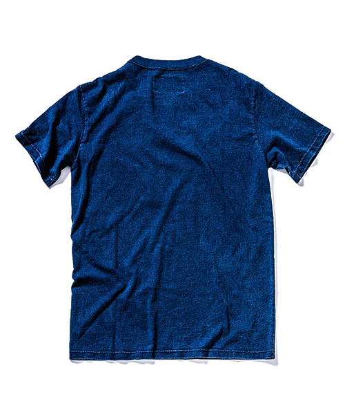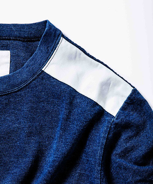 | spec | オリジナルパターンから作製したクルーネックTeeシャツ。ショルダー部分にレザーパッチを配置したTeeシャツ。衿はフライスにて切り替えたクルーネック。縫製後にブリーチウォッシュ加工にてインディゴを色落ちさせた美しい色味に仕上げている。 |