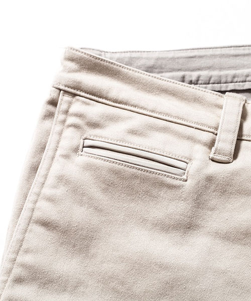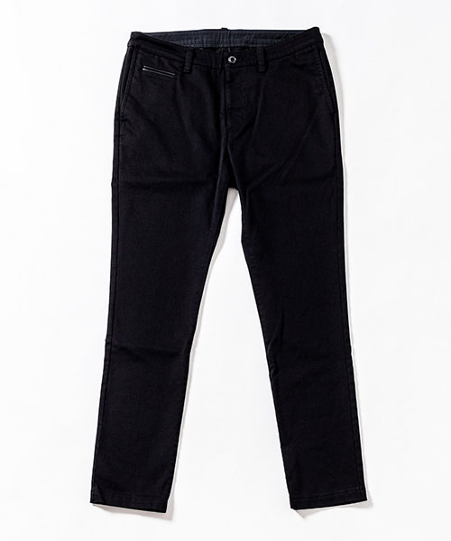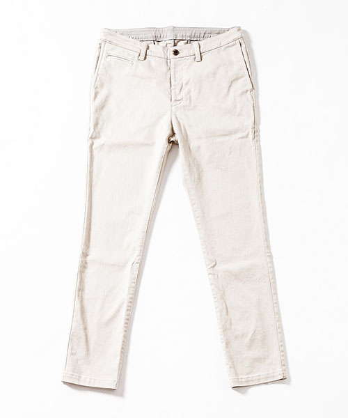| spec | ストレッチ素材を使用したタイトチノパンツ。ファスナーにはYKK universalファスナーを使用。右腰にはレザーを使用した両玉縁コインポケットを配置。縫製後バイオボールウォッシュ加工を施しアタリ感、生地の加工感を追加。裾に向かってテーパードさせたタイトシルエット。シーズン毎に若干のパターン修正を加え、アップデートを繰り返しリリースしている定番の1本。 |