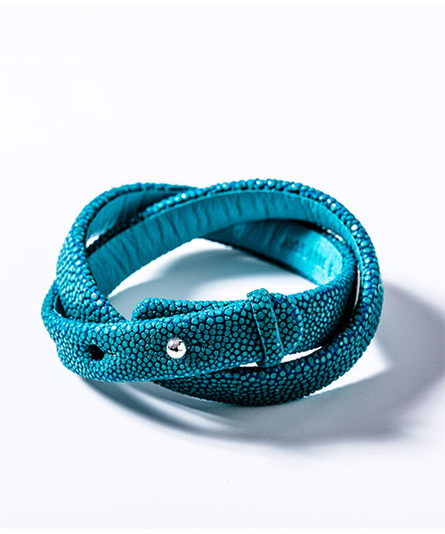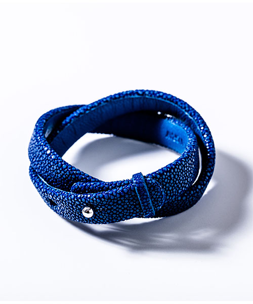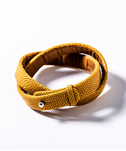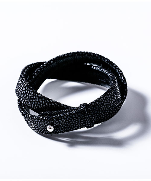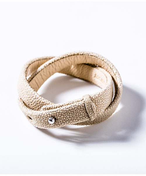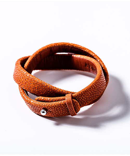 | spec | 非常に硬く扱いにくいスティングレイレザー(エイ革)を独自の鞣し方で柔らかく仕上げ、非常に技術が必要なブレスレットタイプを作製。数多くある色味の中からACANTHUS別注カラーをセレクト。泳ぐ宝石とも言われる素材で、頑丈で磨けば磨く程輝きが増す皮革。 |