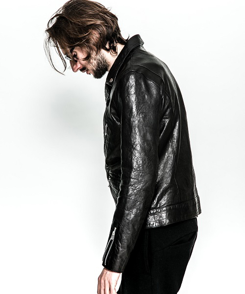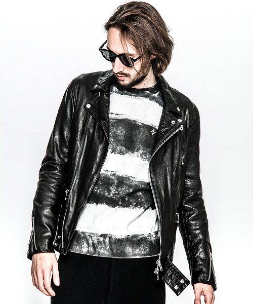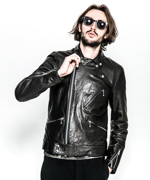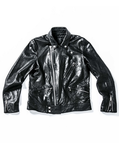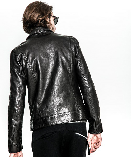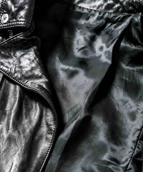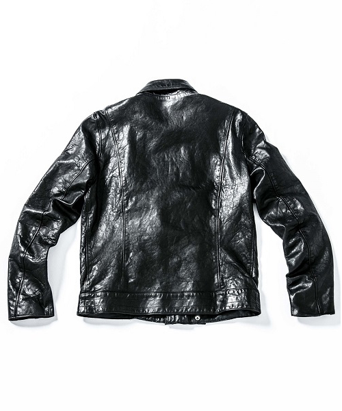 イギリスモーターサイクルのライダースジャケットに見られるディテールを採用。裏地には肌滑りの良いキュプラ素材を使用。ノーマークYKKファスナー、PKにはボールチェーンファスナーを使用。最終工程でドラミング加工を施し、エイジングを表現。