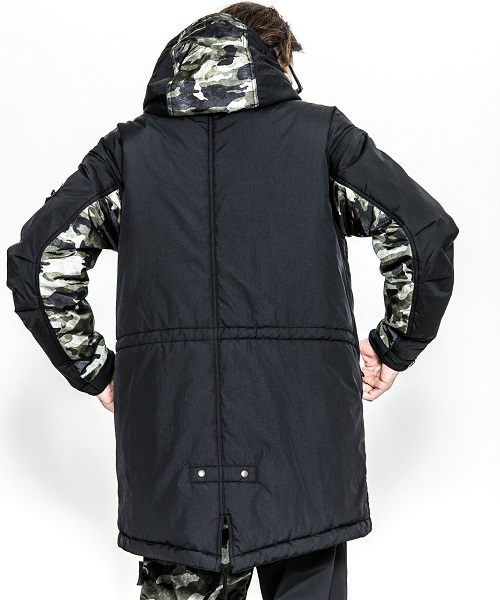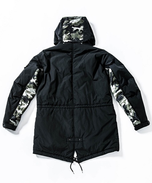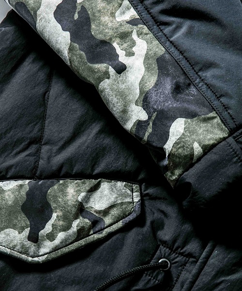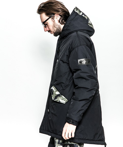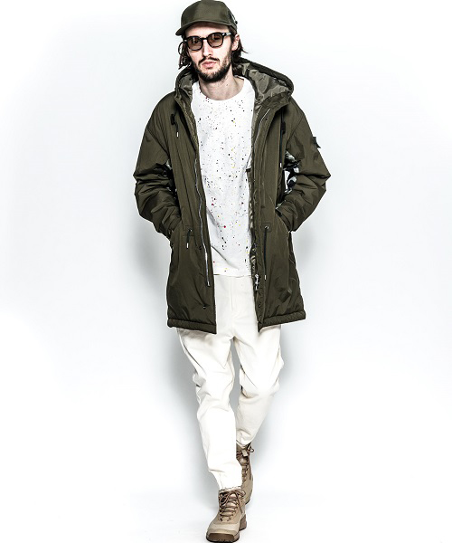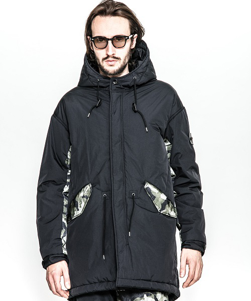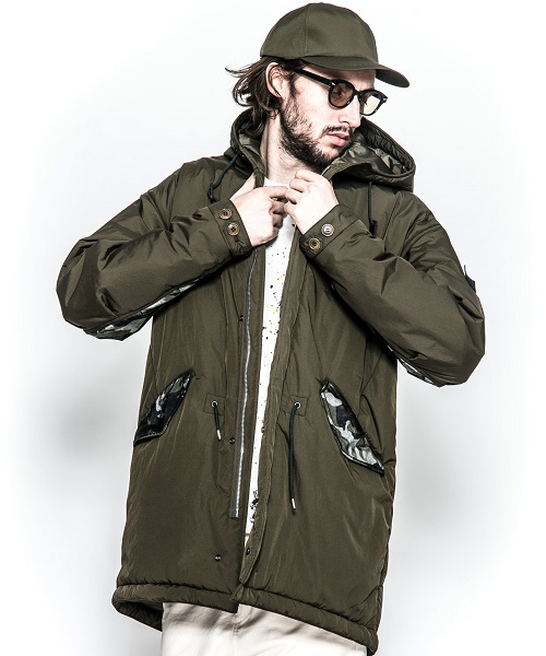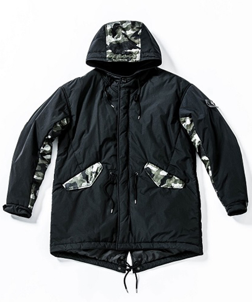 | spec | M-51タイプをベースとした、中綿入りのモッズコート。裏地には軽量感と、強度を備えたマイクロファイバー糸使用のポリエステル生地を使用。ファスナーには軽量感、メッキの高級感を持つYKK社のMATALUXEを使用。袖にはボタンにて取り外し可能のロゴ刺繍入りのレザーパッチを配置。迷彩パーツにはLIMONTA社の素材を使用した特別仕様。 |