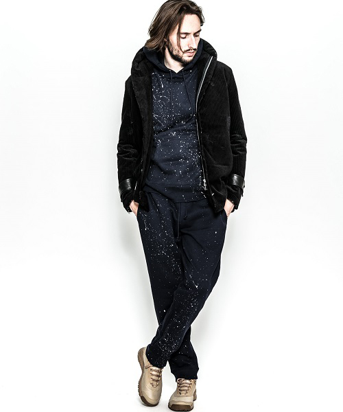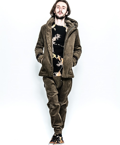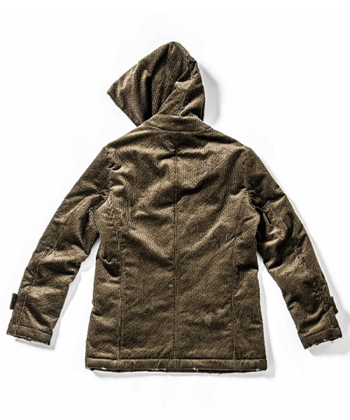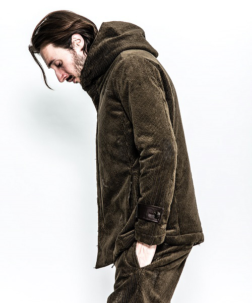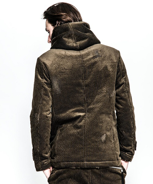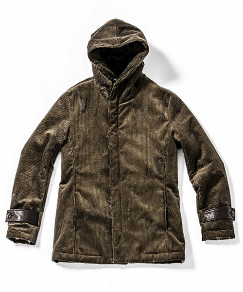 | spec | フード付きのラップコートをベースに、着丈をミドル丈に短く現代的にアレンジ。ファスナーには軽量感、メッキの高級感を持つYKK社のMATALUXEを使用。袖口タブにはラムレザーを配置。裏地にはキュプラ素材を使用し、全体に中綿を挟む事で保温性を確保。袋布には起毛コットンを使用。仕上げに手作業によるダメージ加工を施している。 |