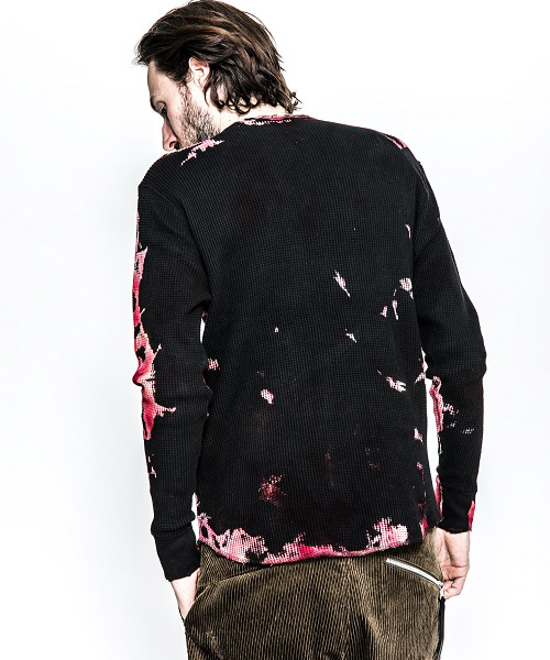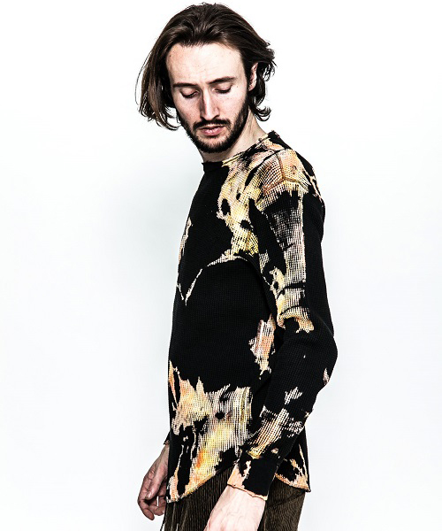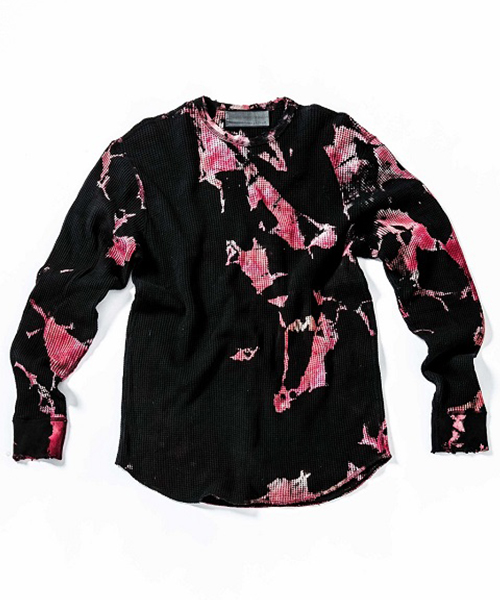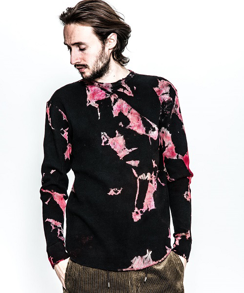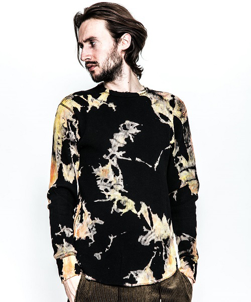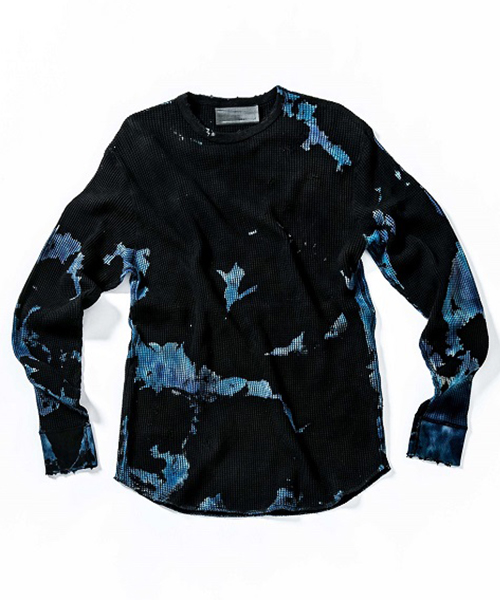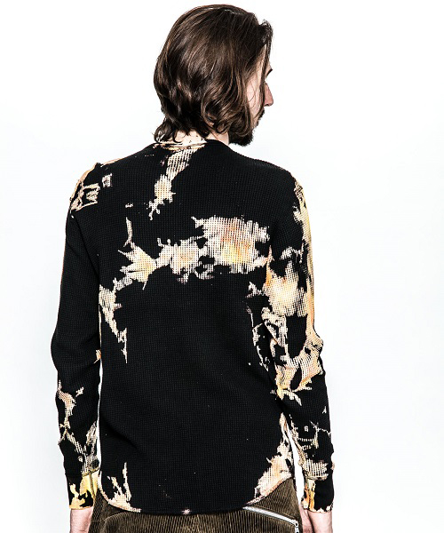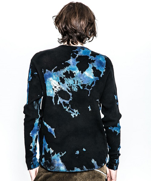 | spec | 縫製はフラットシーマ仕上げ。無地で縫い上げたサーマルカットソーを、タイダイ染め職人による絞り抜染にて染め加工を施している。抜染とは生地の色を抜き、抜いた部分を再び染める技法。タイダイ染め、絞り抜染を組み合わせる事で独特な染めの表情を表現する事に成功した。1点1点柄の出方も異なる特別な仕上がりとなっている。仕上げにダメージ加工を施している。 |