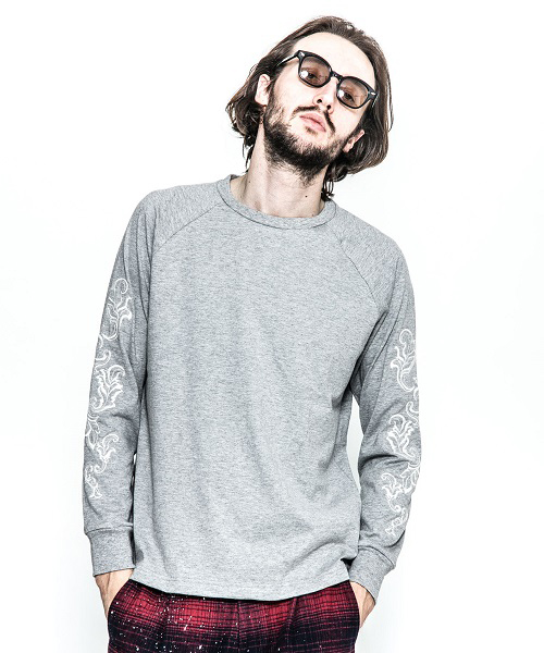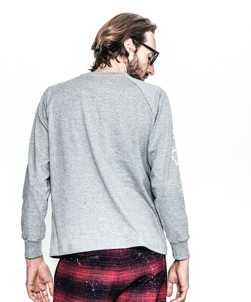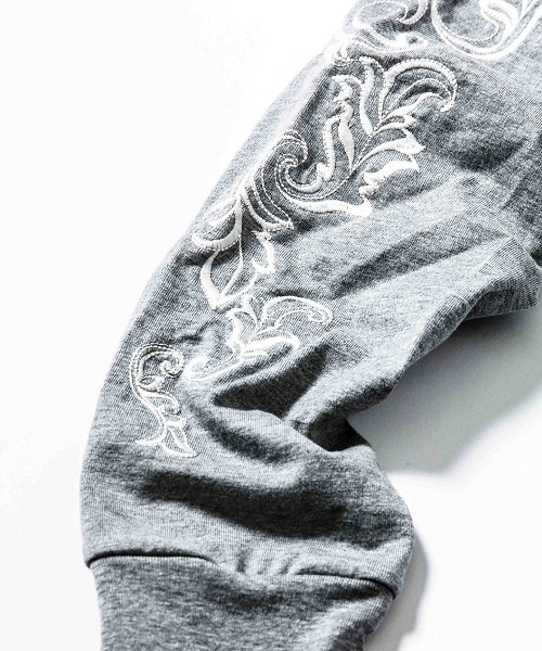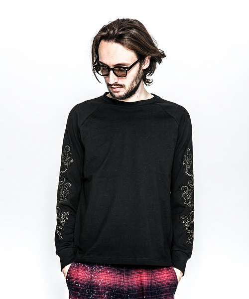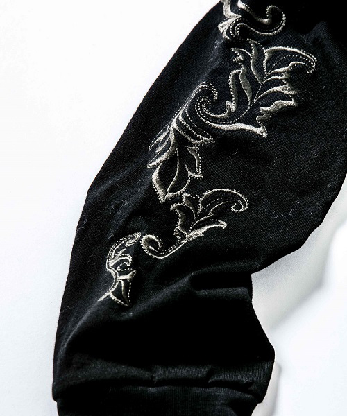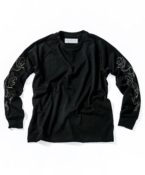 ブランド名であるACANTHUS(地中海地方産ハアザミ 属植物)の形をモチーフにしたデザインを袖パーツに刺繍。アームはラグランスリーブ、袖口はフライスリブ仕様。