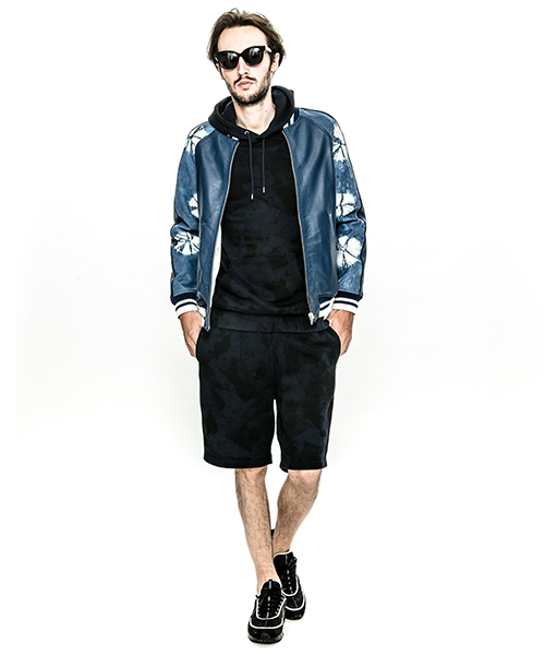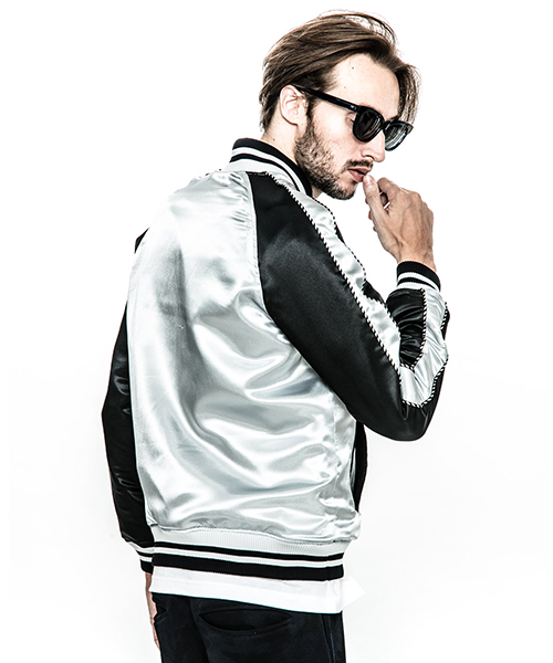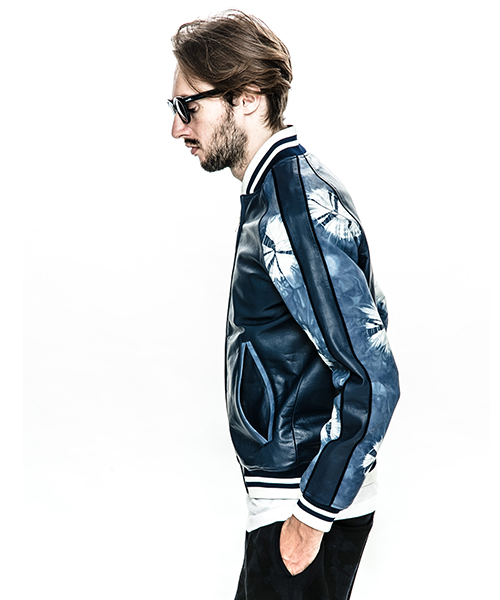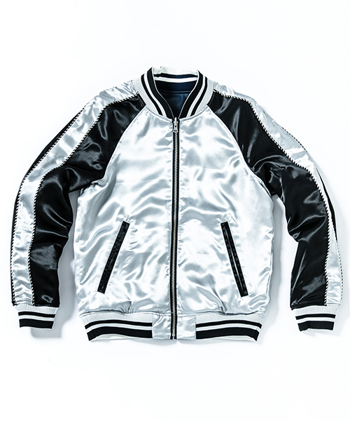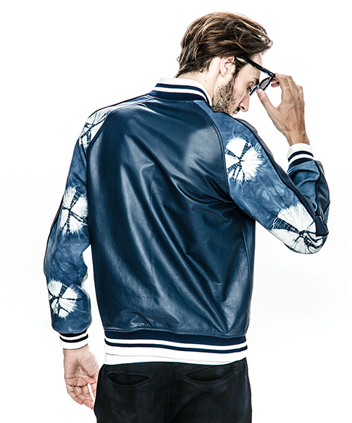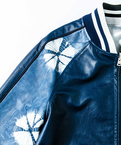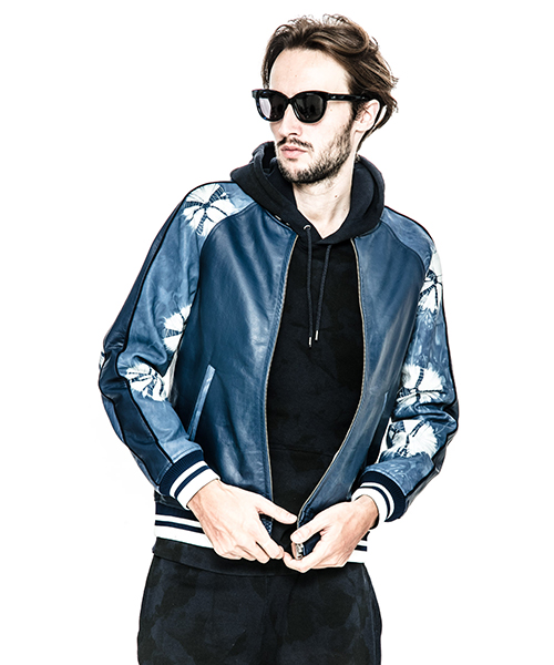 | spec | スーベニアジャケット、通称スカジャンを表はレザー、裏はサテン地のリバーシブル仕様で作製。ファスナーにはvintage感漂う、WALDESファスナーを採用。袖の切り替えにはパイピング装飾を配置。リブには滑らかなポリエステルエンゼルヤーン糸を使用し、表裏の配色に合わせてラインを入れ編み立てた。特別なタイダイ染め加工したレザーを組み合わせて表現した大胆なレザースカジャン。 |