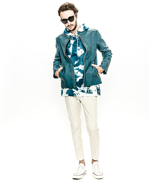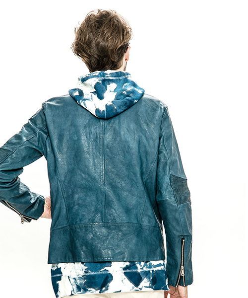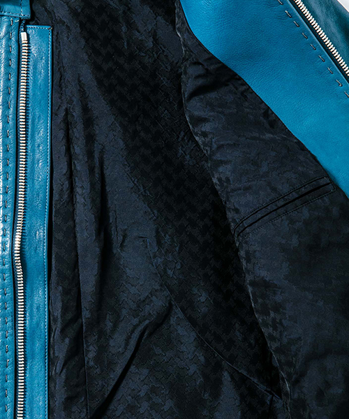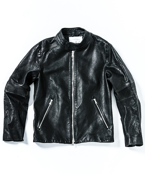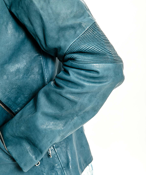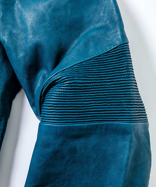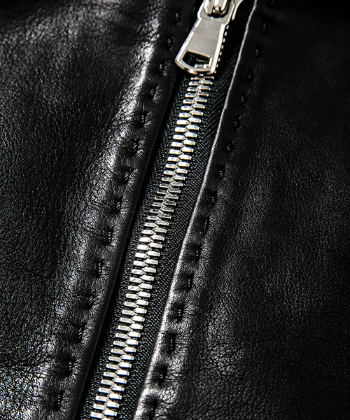 | spec | マチ付きの袖口、衿タブ、重厚感のあるファスナー等ヴィンテージに見られるディティールをベースに、クラシックなアメリカンモーターサイクルのライダースジャケットをベースに製作。裏地には上品な模様をジャガードで表現したキュプラ生地を使用。ファスナーにはハードな製品染め加工に耐えうる高品質なYKK EXCELLAファスナーを採用。袖には同レザーにシャーリング加工を施したパーツを配置。フロントにはハンドステッチを施している。縫製後、ドラミング加工を施し加工感を追加。 |