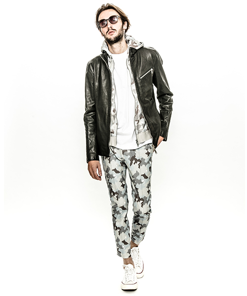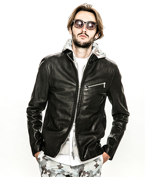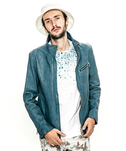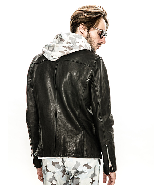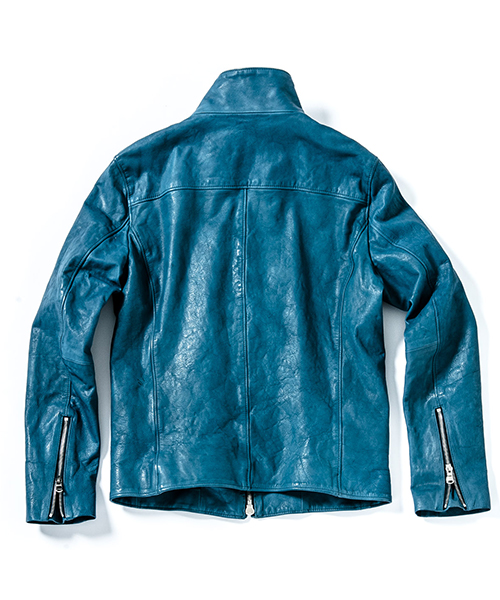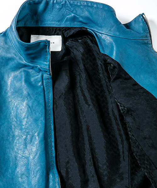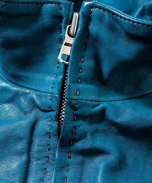 | spec | スポーツテイストなトラックJKTとライダースJKTの要素をミックスしたデザイン。重厚なキップレザーの製品ドラミング加工にて仕上げている。裏地には上品な模様をジャガードで表現したキュプラ生地を使用。ファスナーには高品質なYKK EXCELLAファスナーを採用。フロントにはハンドステッチを施している。縫製後、ドラミング加工を施し加工感を追加。 |
