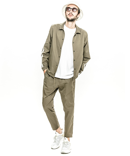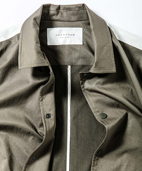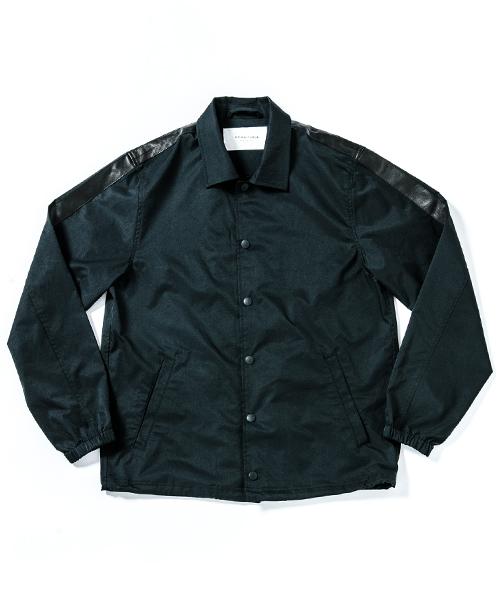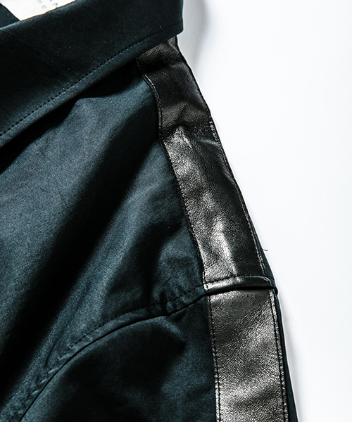 | spec | 高機能素材とレザーを用いて作製したコーチJKT。肩~袖口にかけてレザーラインを配置。レザーには水洗い可能なウォッシャブルラムレザーを使用。フロントにはドット釦を配置。裾はドローコードにて調節可能。アクセントに背中の縫い代はアクセントにサテン地のパイピングテープ始末を採用。一枚仕立ての為、非常に軽量な一枚。 |
