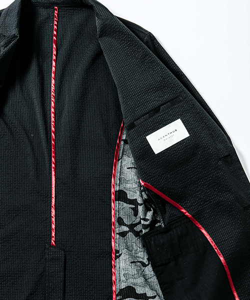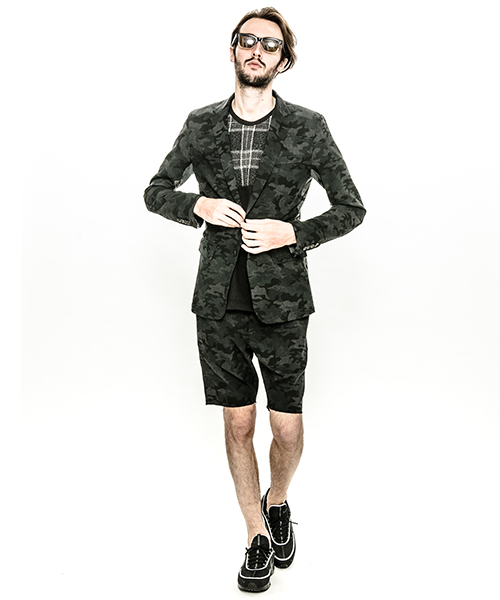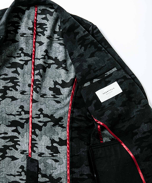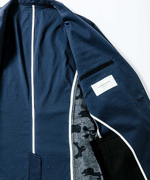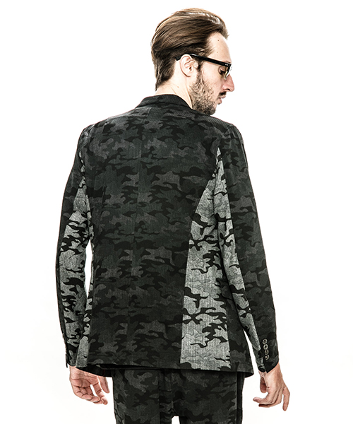 | spec | 一枚仕立てで、非常に軽量なテーラードJKT。フロントは2B釦、袖は本明き仕様。脇身頃パーツ、内袖パーツには無地には迷彩生地、迷彩には生地の裏面を使用し切り替えを表現。裏側の縫い代始末にはサテン地のパイピングテープを配置し色味のアクセントを追加。ストレッチ性を生かした、綺麗なタイトシルエット。 |
