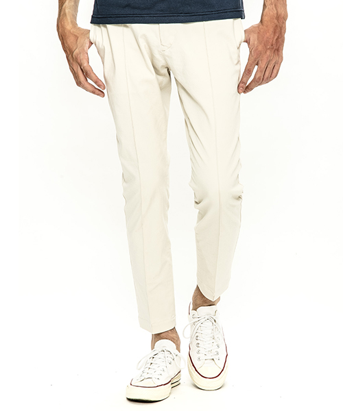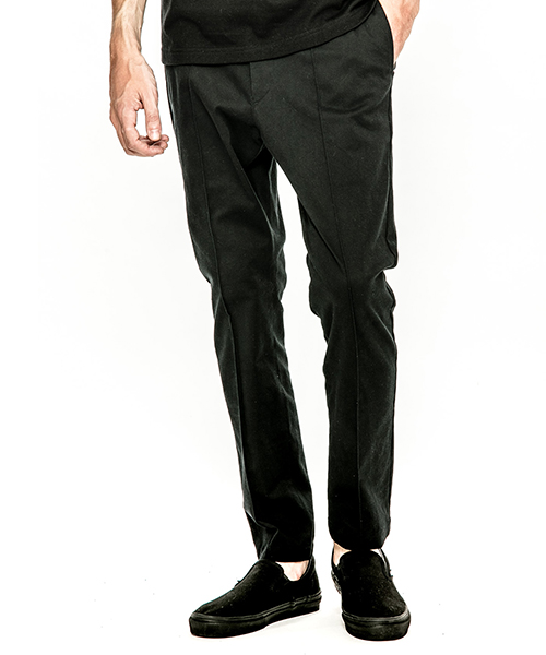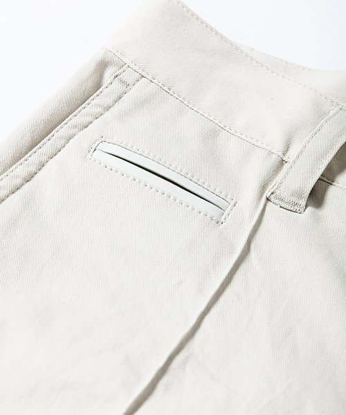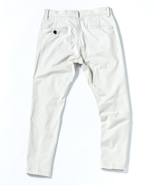 | spec | 上質なインド綿を使用したストレッチタイトチノ。ファスナーには高品質なYKK EXCELLAファスナーを採用。右腰にはレザーを使用した両玉縁コインポケットを配置。縫製前に生地洗い加工を施す事で生地の質感を向上。裾に向かってテーパード9部丈のタイトシルエット。18SSはフロントにピンタックを施しよりタイトなシルエットに。シーズン毎に若干のパターン修正を加え、アップデートを繰り返しリリースしている定番の1本。 |
