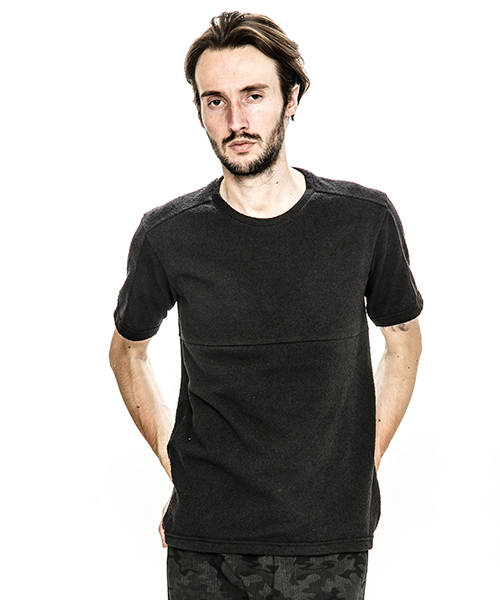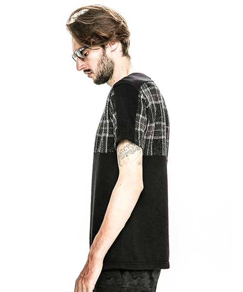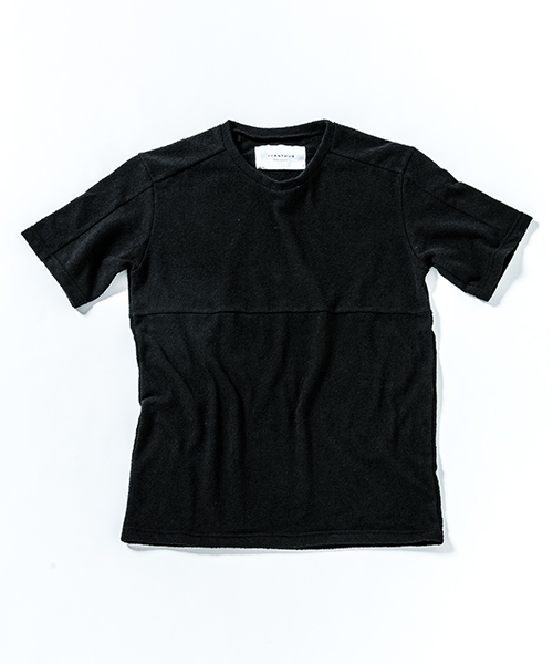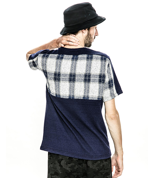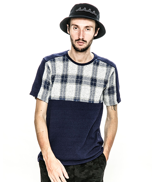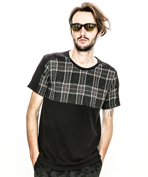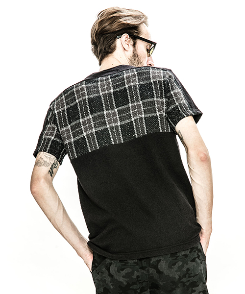 | spec | 同素材の無地とチェックのブークレーパイル生地で仕上げたTシャツ。1色のみオールブラックの展開も追加。視覚的にも絶妙なバランスで柄生地を切り替える事でアクセントを追加。素材を生かした着心地の良いシルエットに仕上げている。 |