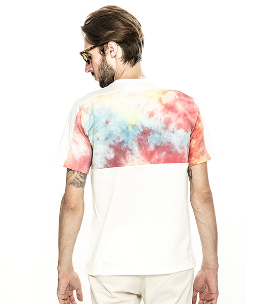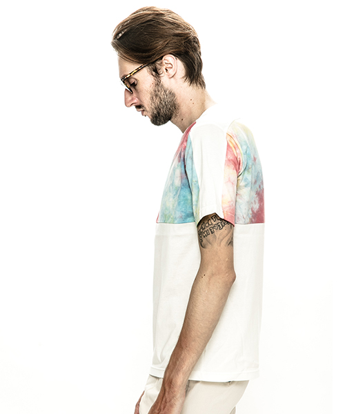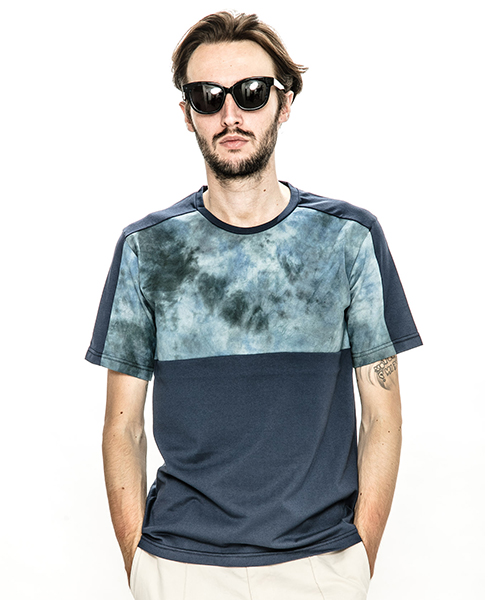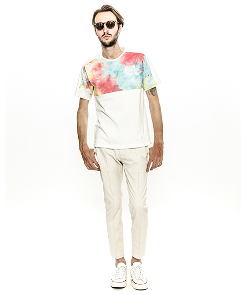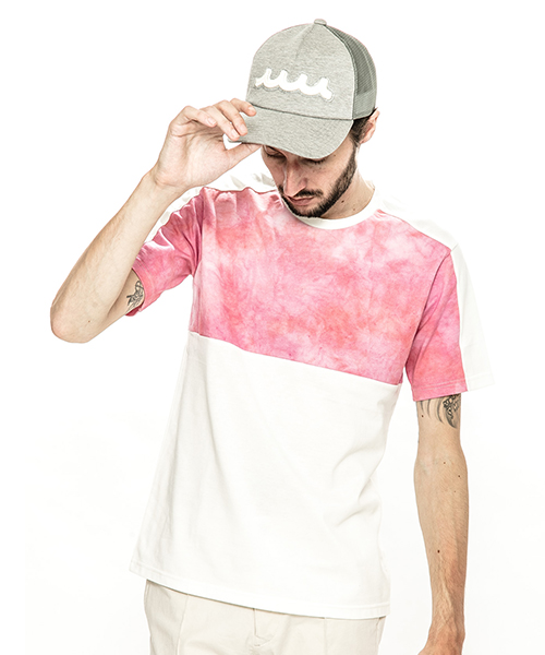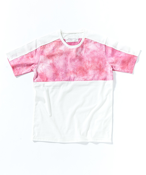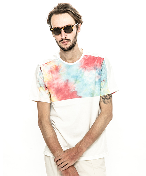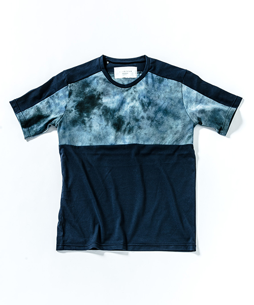 | spec | 無地、染めを施した生地を使用した切り替えTシャツ。視覚的にも絶妙なバランスで柄生地を切り替える事でアクセントを追加。素材を生かした着心地の良いシルエットに仕上げている。タイダイ染め部分は手作業にて染めを施した生地を使用している為、1点1点表情の異なる特別な1枚となる。 |