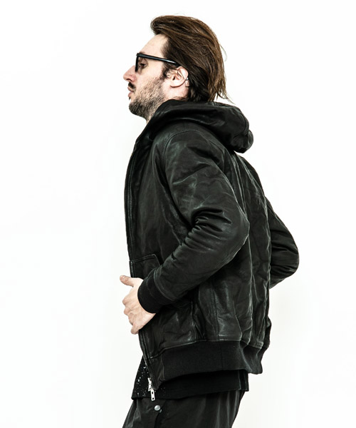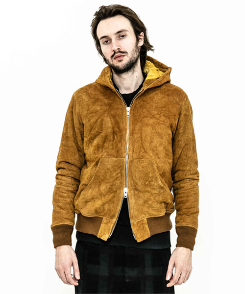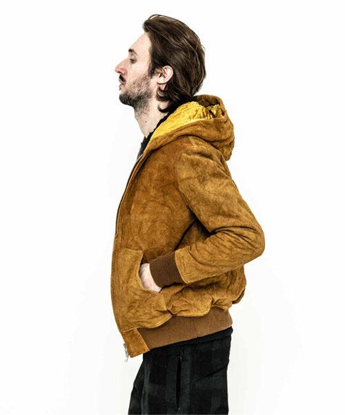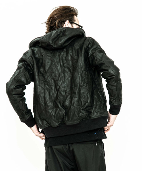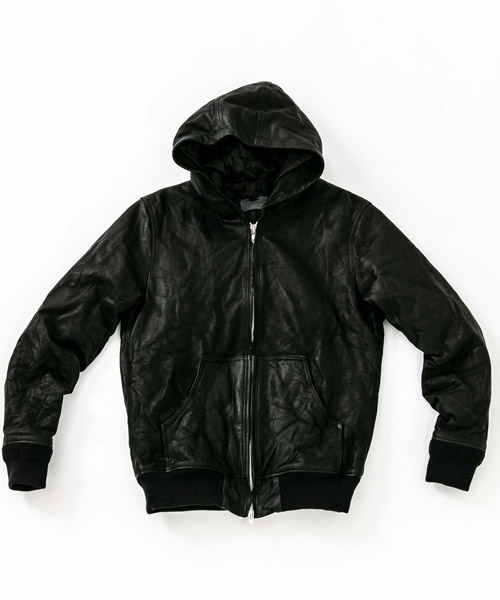spec | ワークジャケットのように動き易さを重視したサイズ感のレザーフーディ。裏地には滑らかな着心地のキュプラ生地を使用。見頃にはキルティング加工、袖は中綿挟みで保温性を確保している。袋布には温かみのある起毛コットンを使用。ファスナーには高品質なYKK EXCELLA製ファスナーを使用。袖リブにはオリジナルで編み立てた段差リブを使用。仕上げにシワ加工を施している。 |