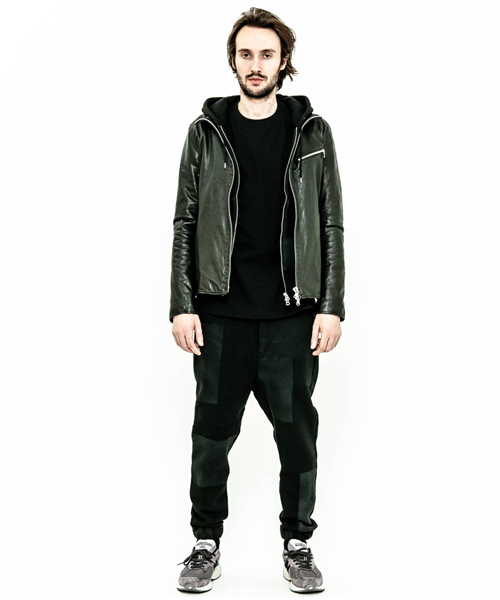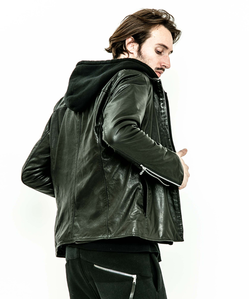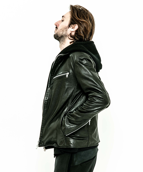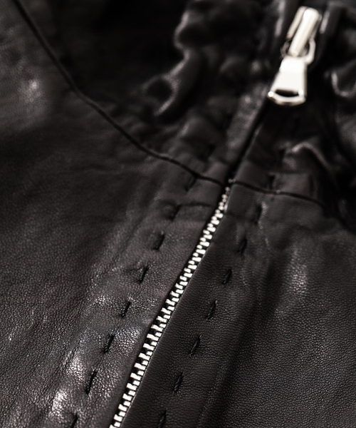 spec | スポーツテイストなトラックJKT、ライダースJKTの要素をミックスしたデザイン。裏地には肌滑りの良いポリエステル素材を使用。ファスナーには高品質なYKKファスナーを使用。フロントには職人手作業による、1番手の糸を用いたハンドステッチを配置。最終工程でドラミング加工を施し、レザーエイジングを表現。 |