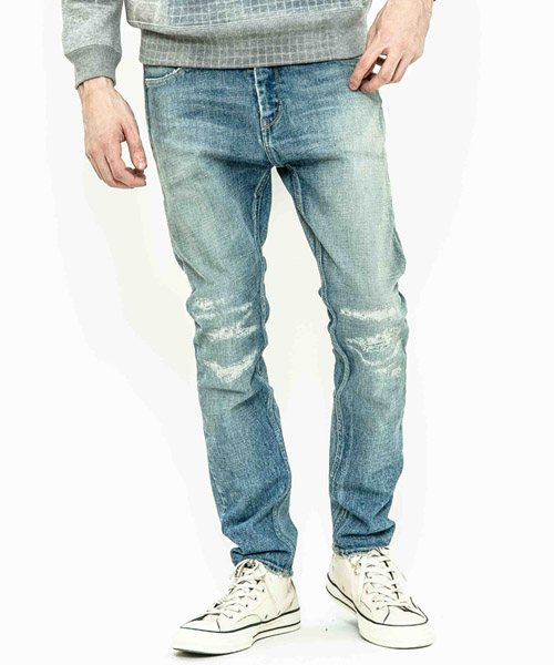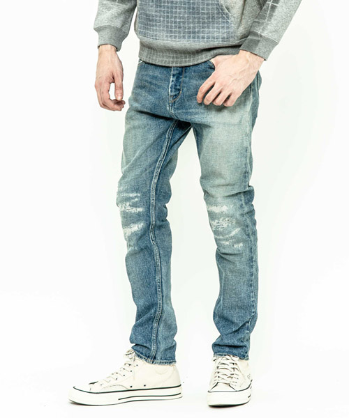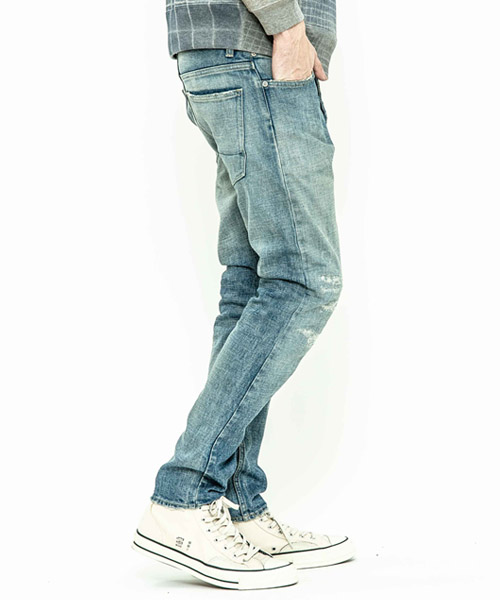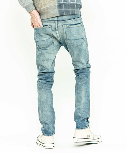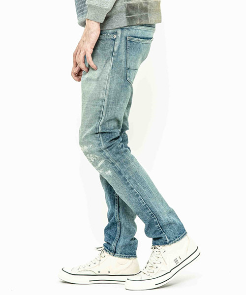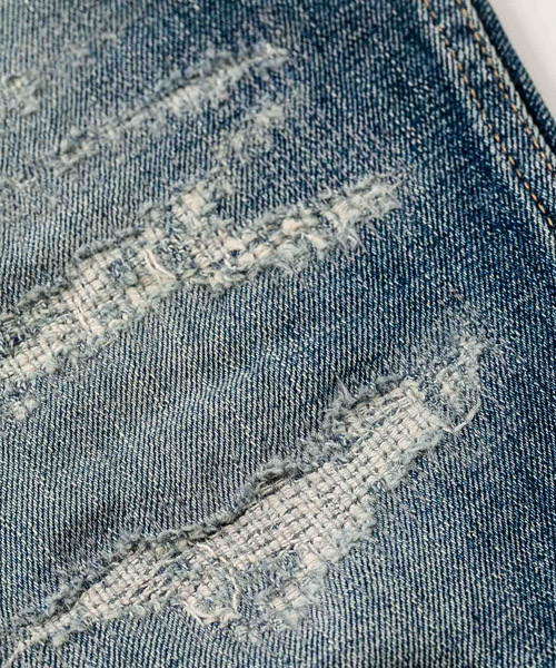 spec | 釦には“ARTISAN SOUL”ロゴ入りのオリジナルタック釦を使用。裾巾を綺麗にテーパードさせたタイトシルエット。後ろパッチポケットには特殊ミシンによるハシゴステッチを施している。革パッチは加工にギリギリ耐えられるバックスキンを敢えて使用することで1点1点違った表情に。エッジのダメージ、ヒゲ、膝のリペアなどシンプルにヴィンテージデニムを追い求めた1本。 |