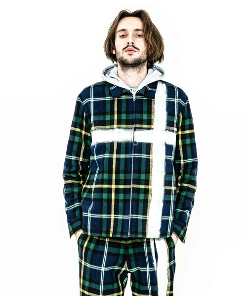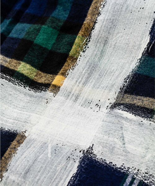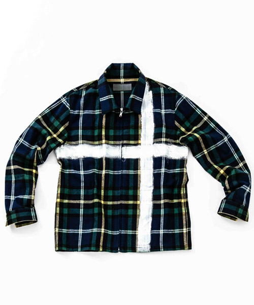 spec | フロントはファスナー開きのシンプルなシャツジャケット。両サイドのシームにはポケットを配置。身頃を縦横に大胆に施されたペイントはペインターが1点ずつハンドペイントにより施した全く同じようには再現できない1点物感がインパクト抜群。 |