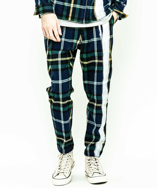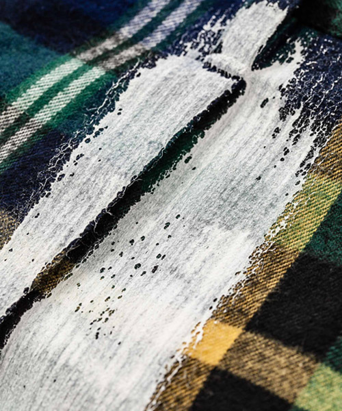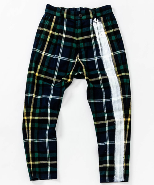 spec | シャツジャケットの組下となるリラクシングスラックス。身頃を縦断する大胆に施されたペイントはペインターが1点ずつハンドペイントにより施した全く同じようには再現できない1点物感がインパクト抜群。 |
