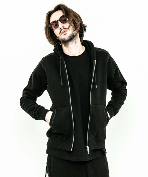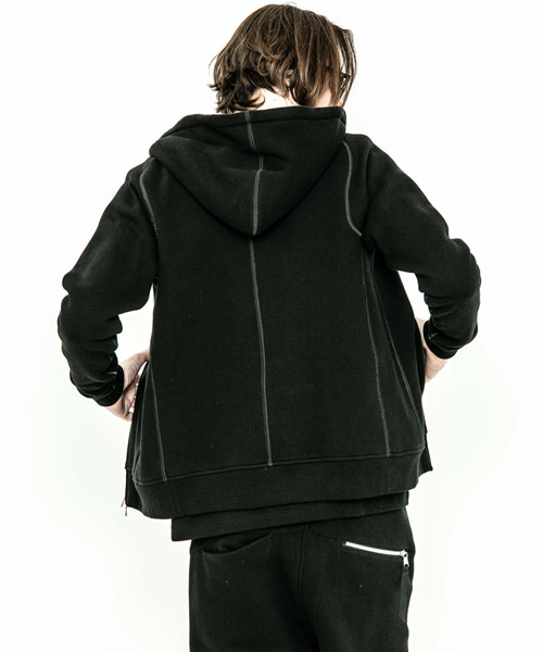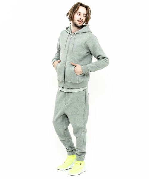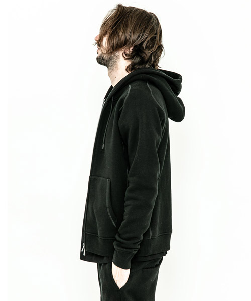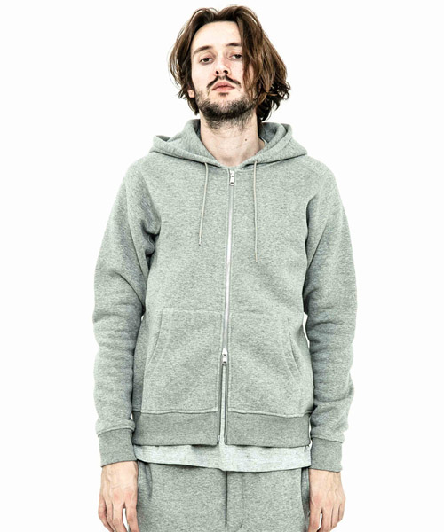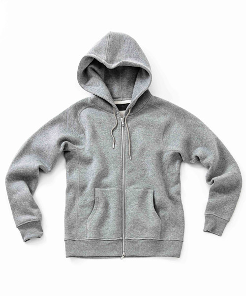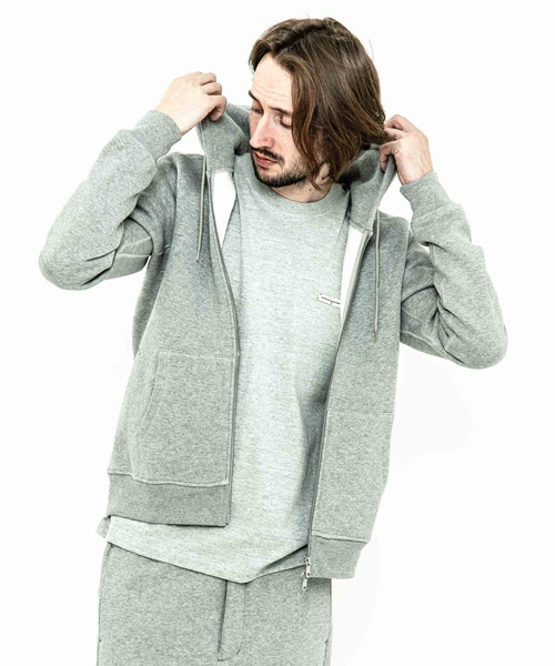 spec | 度詰裏毛起毛を使用したフルジップフーディー。最大の特徴はアームスリーブ脇のマチ付き仕様の袖付け。軍隊の運動時に、腕を上げた際に裾が上がり、肌が見えないように開発されたと言われている通称フリーダムスリーブ。脇にマチを配置する事で肩、腕が動き易い仕様となっている。40年代~50年代のスウェットアイテムに見られるディティールだが、縫製コストのかかる仕様で徐々に姿を消していったと言われている。現在も技術の高い縫製者が必要な仕様。ファスナーには軽量感、メッキの高級感を持つYKK社のMATALUXEを使用。PW品番は特殊な手法によるプリントにて、1点1点特別なパッチワーク柄を表現している。 |