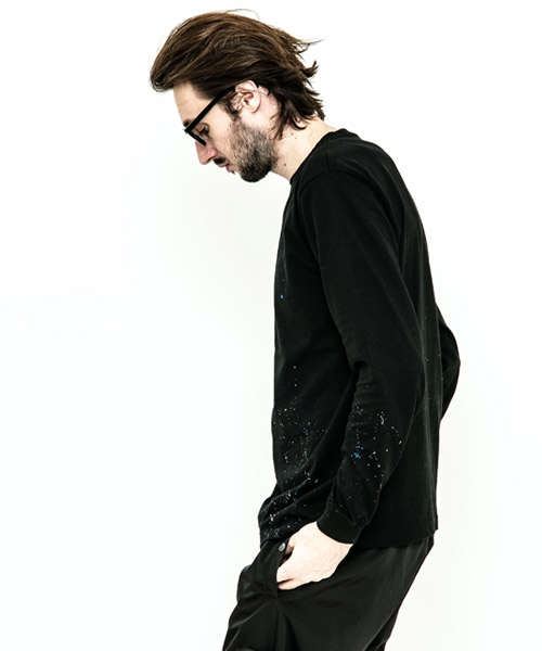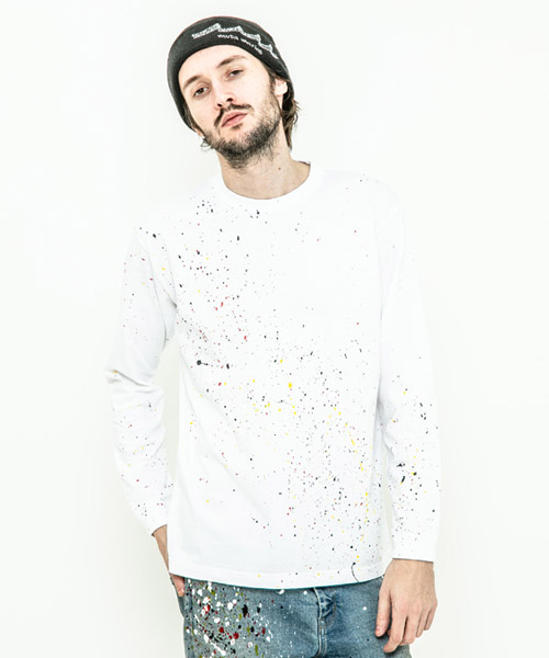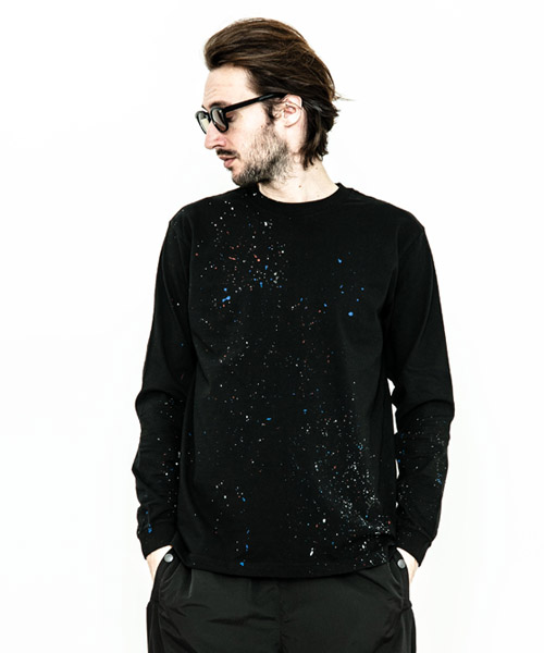 spec | 首フライスは2本針縫製、丸胴に編み立てた身頃を使用したベーシックでスマートなシルエットのL/S Tシャツ。全体に散りばめたスプラッシュペイントはペインターによる手仕事で施している。 |